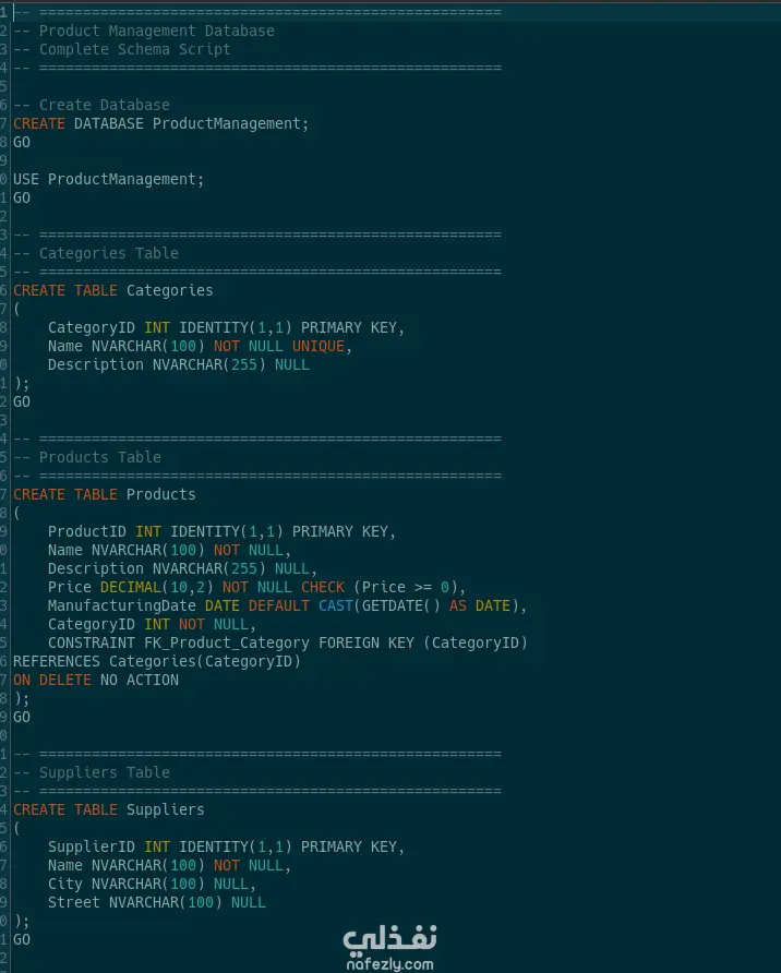 هذا المشروع عبارة عن تصميم وتنفيذ قاعدة بيانات متكاملة لنظام إدارة المنتجات (Product Management System) باستخدام SQL Server، بهدف تنظيم بيانات المنتجات والعمليات المرتبطة بها داخل الشركة بشكل دقيق وقابل للتوسع. بدأ العمل بتحليل المشكلة والمتطلبات، ثم استخراج الكيانات الأساسية والعلاقات بينها، وبعد ذلك تم تصميم مخطط ERD ومخطط الـ Schema وتحويلهما إلى سكربت SQL جاهز لإنشاء قاعدة البيانات.