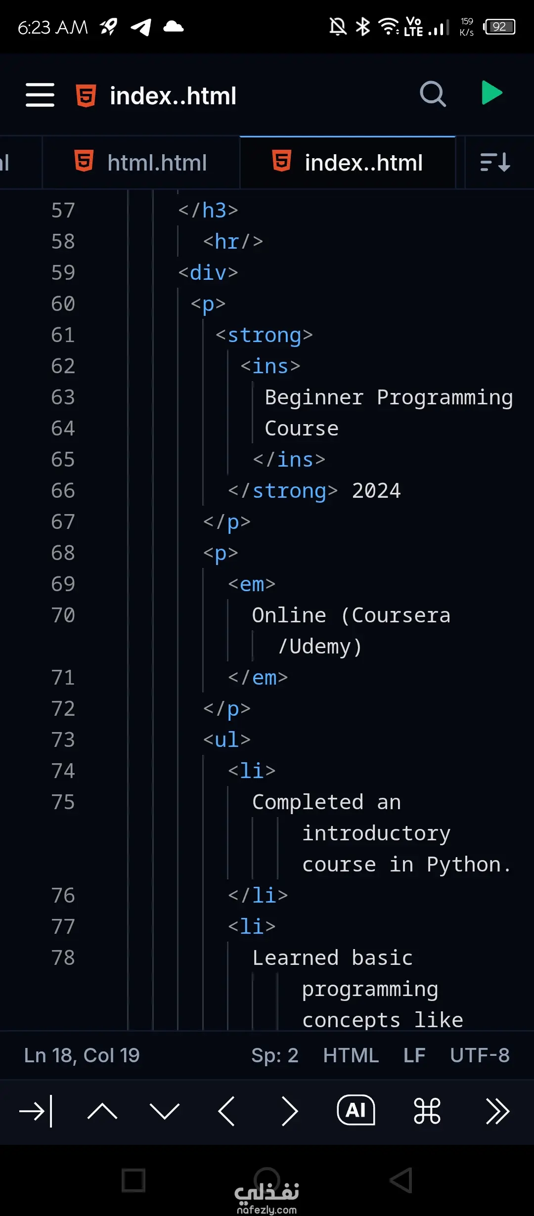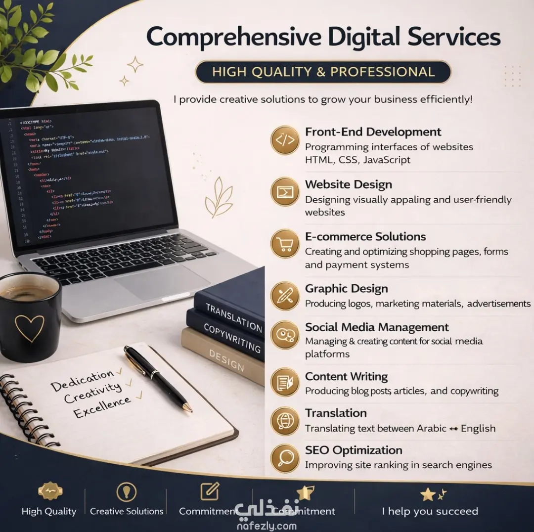 Professional Technical Translator"أقدم خدمات رقمية متنوعة باحترافية وجودة عالية، تشمل تطوير واجهات المواقع (Front-End) باستخدام HTML وCSS بتصميم جذاب ومتوافق مع جميع الأجهزة.