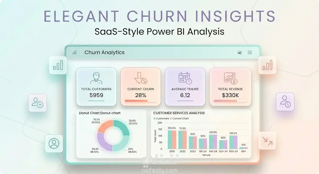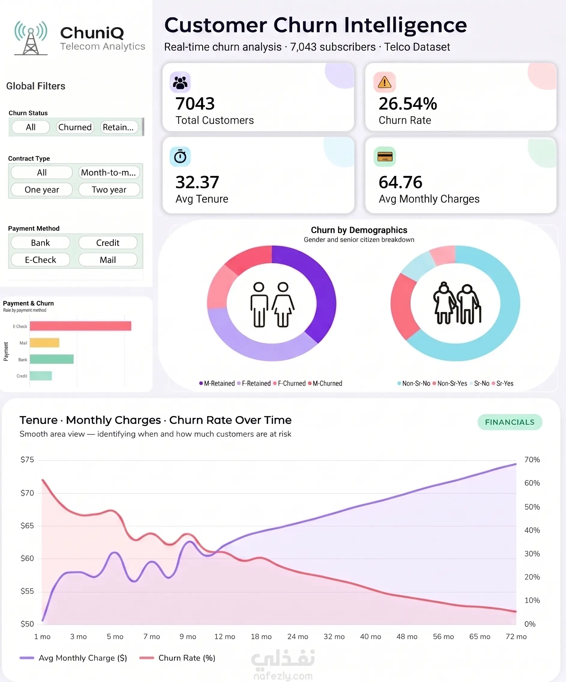 في هذا المشروع، قمت ببناء وتطوير لوحة تحكم تفاعلية (Interactive Dashboard) باستخدام Power BI لتحليل بيانات تسرب العملاء في قطاع الاتصالات. لم يكن الهدف مجرد سرد الأرقام، بل تقديم "تطبيق بيانات" متكامل يعتمد على واجهة مستخدم (UI) عصرية تحاكي تطبيقات الويب الحديثة (SaaS)، مما يوفر لأصحاب القرار تجربة تصفح سلسة ومريحة للعين، بعيداً عن التصميمات التقليدية والمزدحمة. - أهداف المشروع والقيمة المضافة (Business Impact): فهم سلوك العملاء: تحليل دقيق لتأثير العوامل المختلفة (مثل نوع العقد، طرق الدفع، والخدمات المشترك بها) على قرار العميل بالبقاء أو المغادرة. تحديد الفئات الأكثر عرضة للتسرب: اكتشاف الأنماط الديموغرافية والمالية المرتبطة بأعلى معدلات الـ Churn. دعم اتخاذ القرار: توفير مؤشرات أداء رئيسية (KPIs) واضحة ومباشرة (إجمالي العملاء، معدل التسرب، متوسط الإيرادات، ومتوسط مدة البقاء) في أعلى الشاشة لسهولة المتابعة. - ما يميز هذا العمل (UI/UX & Data Storytelling): تصميم عصري ونظيف (Modern Aesthetic): الاعتماد على ألوان الباستيل الهادئة والمريحة للعين، مع التخلي التام عن الألوان الداكنة أو الحادة لتوفير راحة بصرية للمستخدم. تنسيق احترافي (Soft Shadows & Rounded Corners): تصميم كروت المؤشرات والرسوم البيانية بحواف دائرية ناعمة وظلال خفيفة، لتبدو وكأنها عناصر عائمة (Floating Cards). هيكلة البيانات (Data Organization): تقسيم لوحة التحكم بذكاء لاستيعاب حجم كبير من البيانات (ديموغرافية، مالية، وخدمية) دون التسبب في أي تشتت أو ازدحام بصري (Decluttered Layout). تفاعل مرن: فلاتر ديناميكية سلسة لتخصيص الرؤى بناءً على (الجنس، نوع العقد، وغيرها). - الأدوات والتقنيات المستخدمة: Microsoft Power BI (Data Modeling, DAX, Advanced Visualization) UI/UX Design for Dashboards (Custom Layouts, Color Psychology) Data Cleaning & Preparation