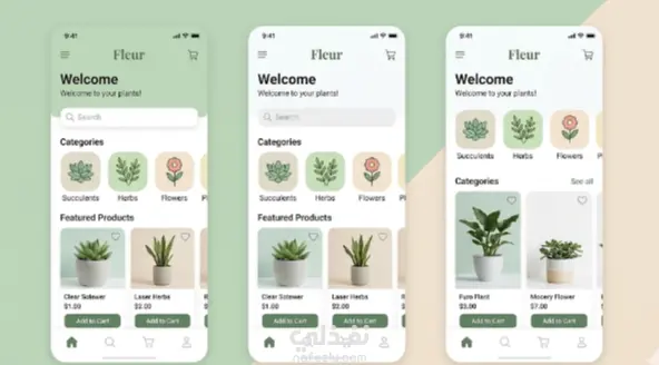 تصميم واجهة تطبيق موبايل لبيع النباتات الطبيعية (Fleur