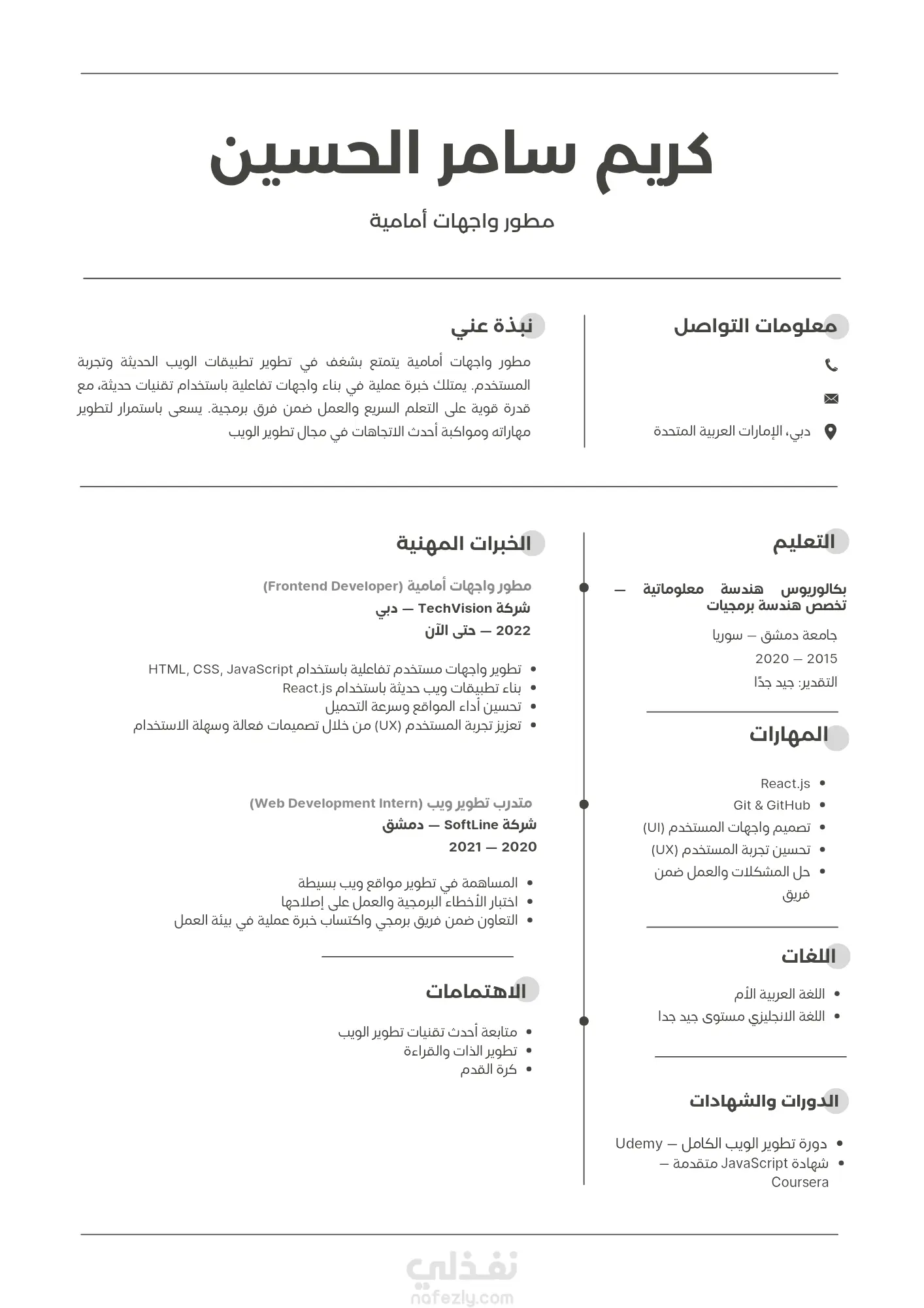 تم تصميم سيرة ذاتية بشكل ابداعي لمطور واجهات أمامية باللغة العربية