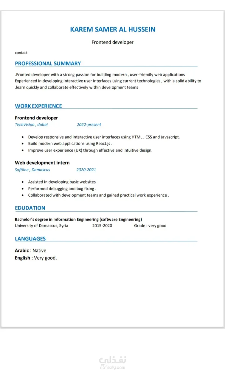 تم تصميم سيرة ذاتية باللغة الانكليزية لمهندس متخصص في مجال تطوير الواجهات الأمامية ووفق المعايير التي تتطلبها انظمة الشركات (ATS)