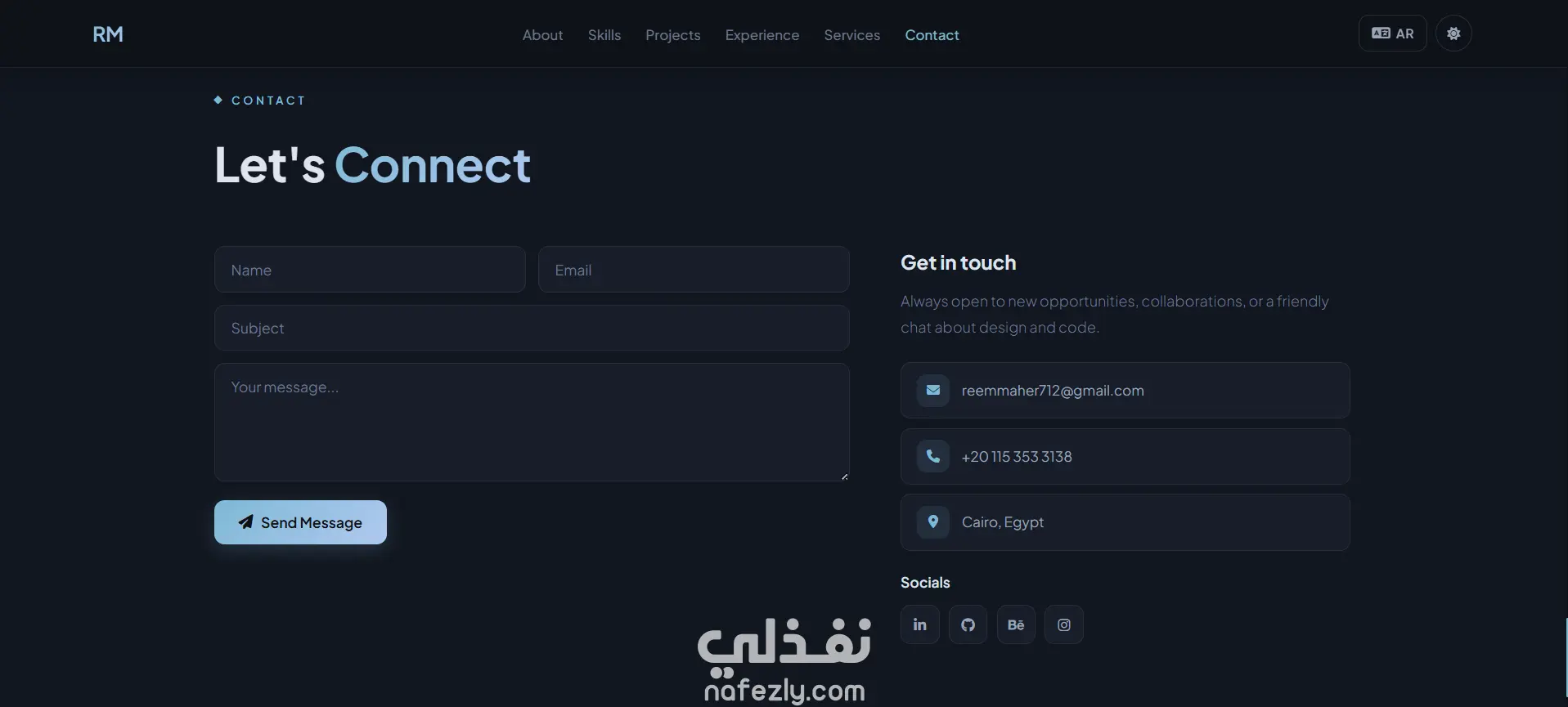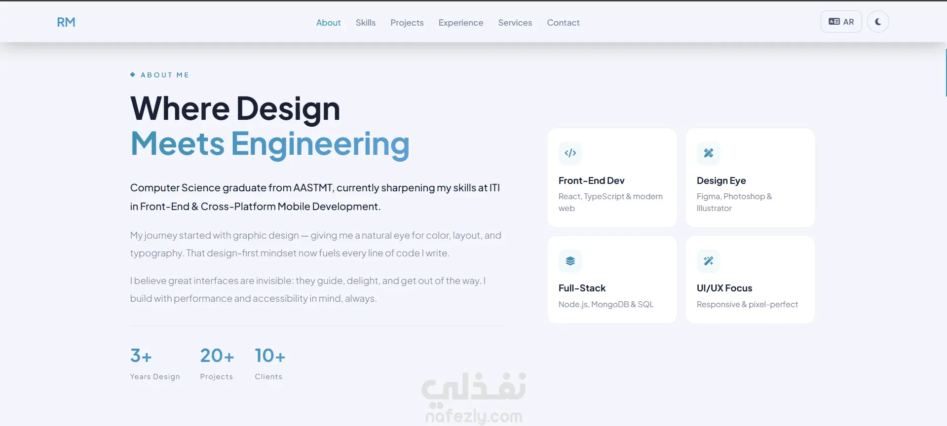 قمت بتصميم وتطوير موقع بورتفوليو احترافي متكامل يعكس هويتي كمطوّرة Front-End ومصممة UI/UX، مع التركيز على تجربة مستخدم سلسة وتصميم عصري جذاب. يتكون الموقع من عدة سكاشن منظمة تشمل: Hero Section: واجهة رئيسية جذابة مع تأثير typing و CTA واضح. About Section: عرض نبذة شخصية بأسلوب قصصي مع إحصائيات وإنجازات. Skills Section: عرض المهارات بشكل تفاعلي باستخدام progress bars. Projects Section: عرض المشاريع مع تصميم Cards حديث وتأثيرات Hover. Experience Section: Timeline احترافي لعرض الخبرات والمسيرة التعليمية. Services Section: توضيح الخدمات المقدمة بشكل Structured وواضح. Contact Section: نموذج تواصل تفاعلي مع معلومات الاتصال والسوشيال ميديا. يدعم الموقع الوضع الداكن والفاتح (Dark/Light Mode) مع إمكانية التبديل، بالإضافة إلى دعم تعدد اللغات (عربي / إنجليزي) تم تنفيذ الموقع باستخدام HTML5, CSS3, JavaScript مع كتابة كود نظيف ومنظم، مع الاهتمام بالـ Responsive Design ليعمل بكفاءة على جميع الأجهزة، بالإضافة إلى استخدام Animations ناعمة لتحسين تجربة المستخدم.