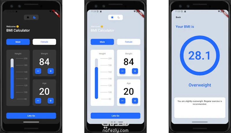 تطبيق bmi calculaor بتصميم جذاب واداء ممتاز ويدعم الوذع المضيء والمعتم