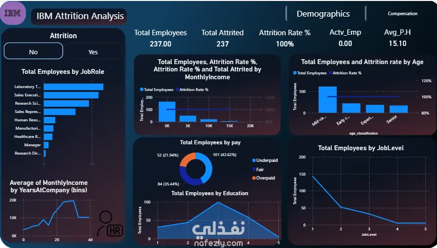 قمت بتصميم وتطوير لوحة معلومات تفاعلية باستخدام Power BI لتحليل معدلات الموظفين (Attrition) وفهم العوامل المؤثرة عليها. ركزت الداشبورد على عرض المؤشرات الرئيسية مثل إجمالي الموظفين عدد الموظفين المغادرين ومعدل الـ Attrition مع تحليل البيانات من جوانب مختلفة مثل الخصائص الديموغرافية الأقسام، التعليم العمل الإضافي الدخل الشهري، المستوى الوظيفي والراتب ساعدت الداشبورد في تحويل البيانات إلى رؤى واضحة تدعم اتخاذ القرار وتحسين فهم أسباب ترك الموظفين للعمل.