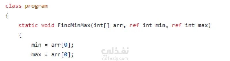 A C# console application that reads numbers from the user, stores them in an array, and calculates the minimum and maximum values using a custom method with reference parameters.