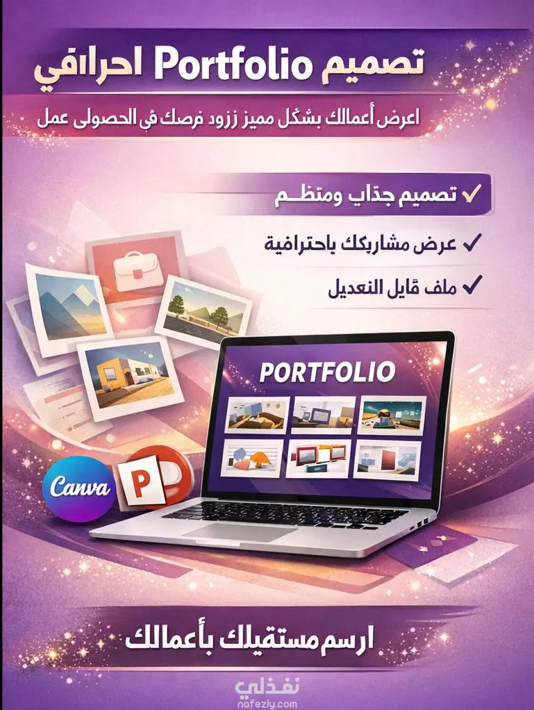 أقدم لك تصميم Portfolio مميز سواء على PowerPoint أو Canva لعرض مشاريعك بطريقة جذابة ومنظمة.