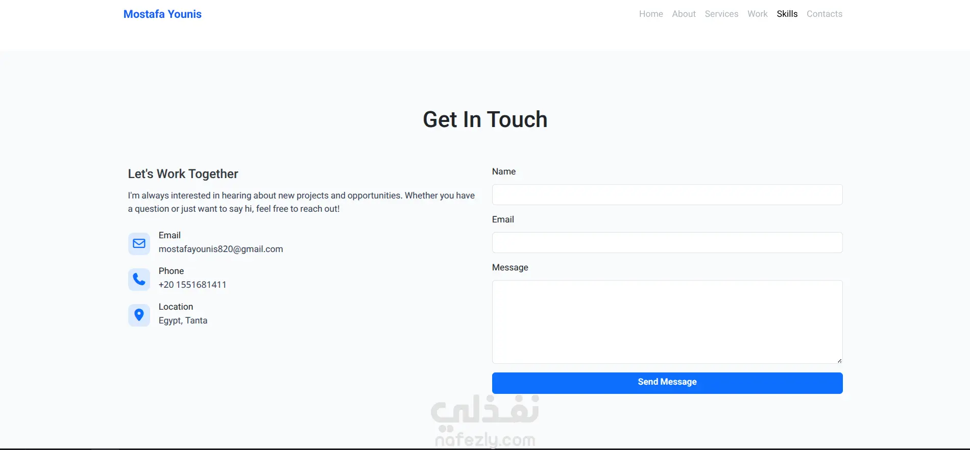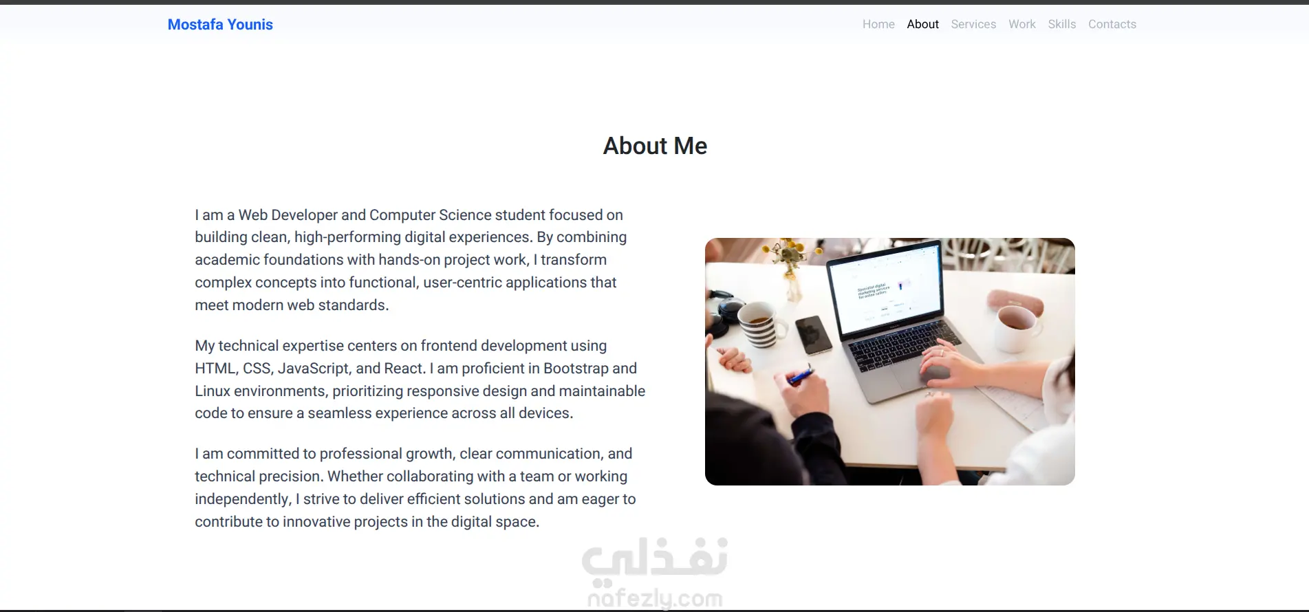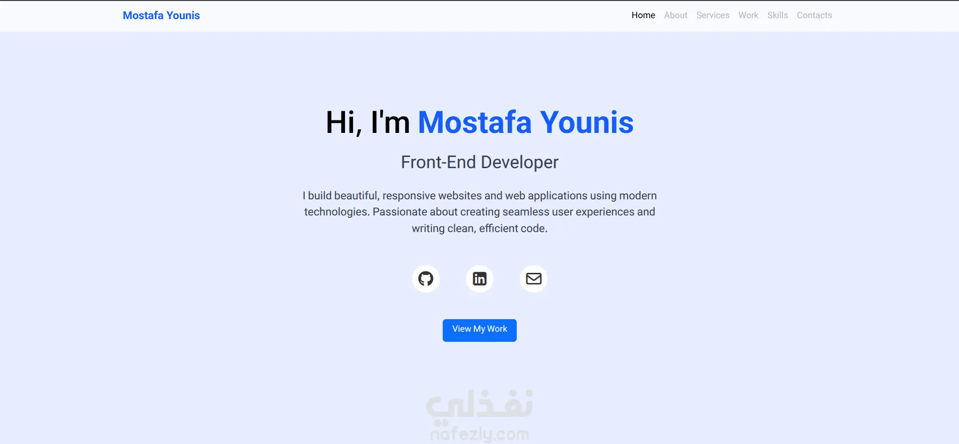 الموقع التعريفي (Portfolio) الخاص بي، يستعرض مهاراتي وخبراتي في مجال تطوير واجهات المستخدم (Front-End Development). يتميز الموقع بتصميم عصري ومتجاوب، ويضم أقساماً لعرض المشاريع السابقة، والخدمات التقنية التي يقدمها مثل تحويل التصاميم إلى مواقع حية وتحسين أداء المواقع، بالإضافة إلى وسائل التواصل المباشرة.
