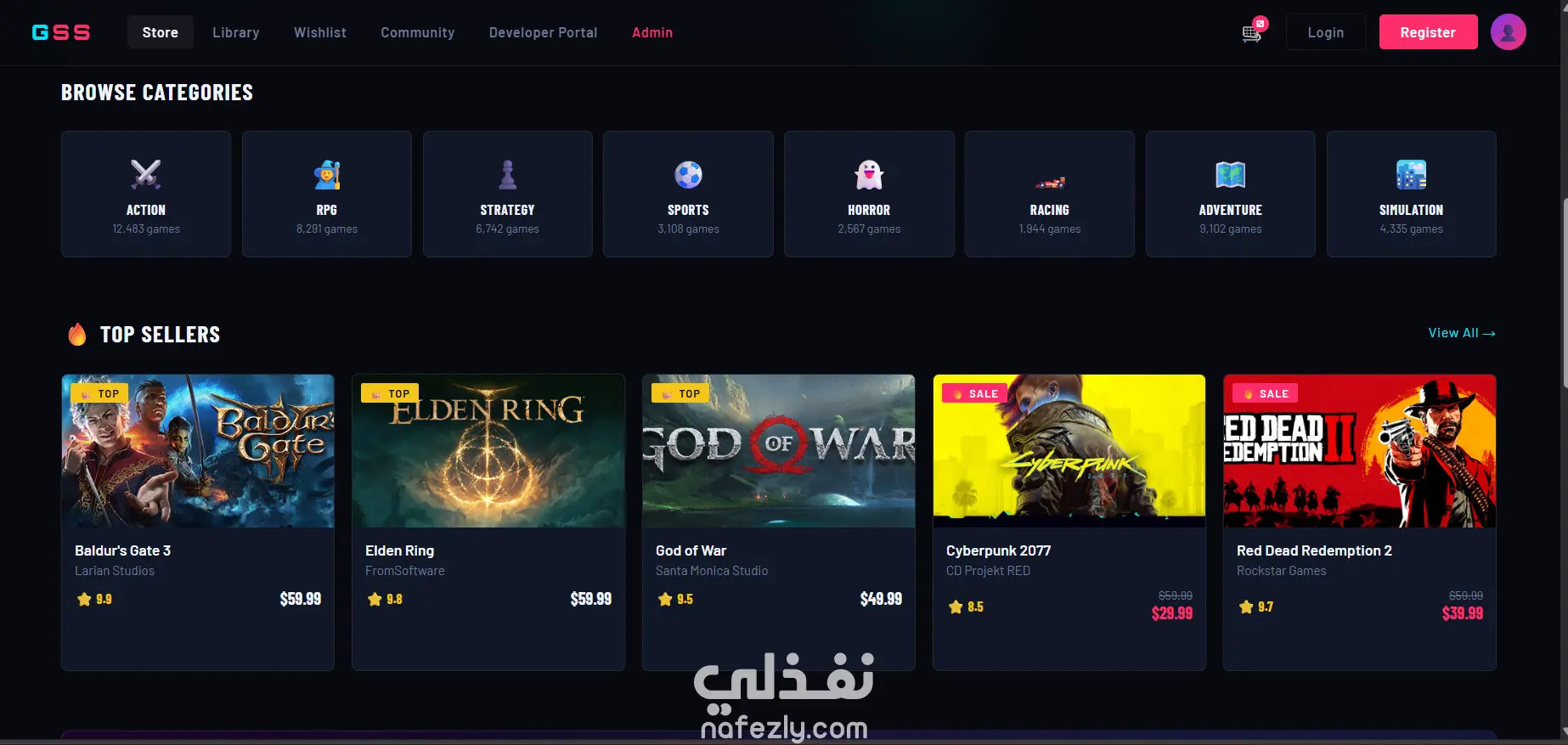 Navigation bar with sections like Store, Library, Wishlist, and Admin (UI only)