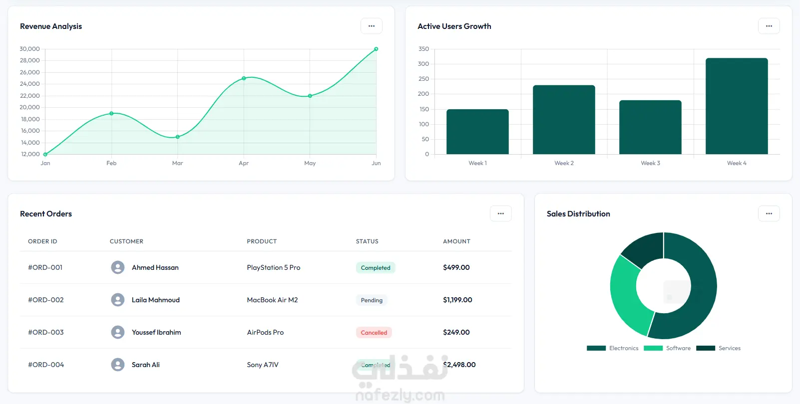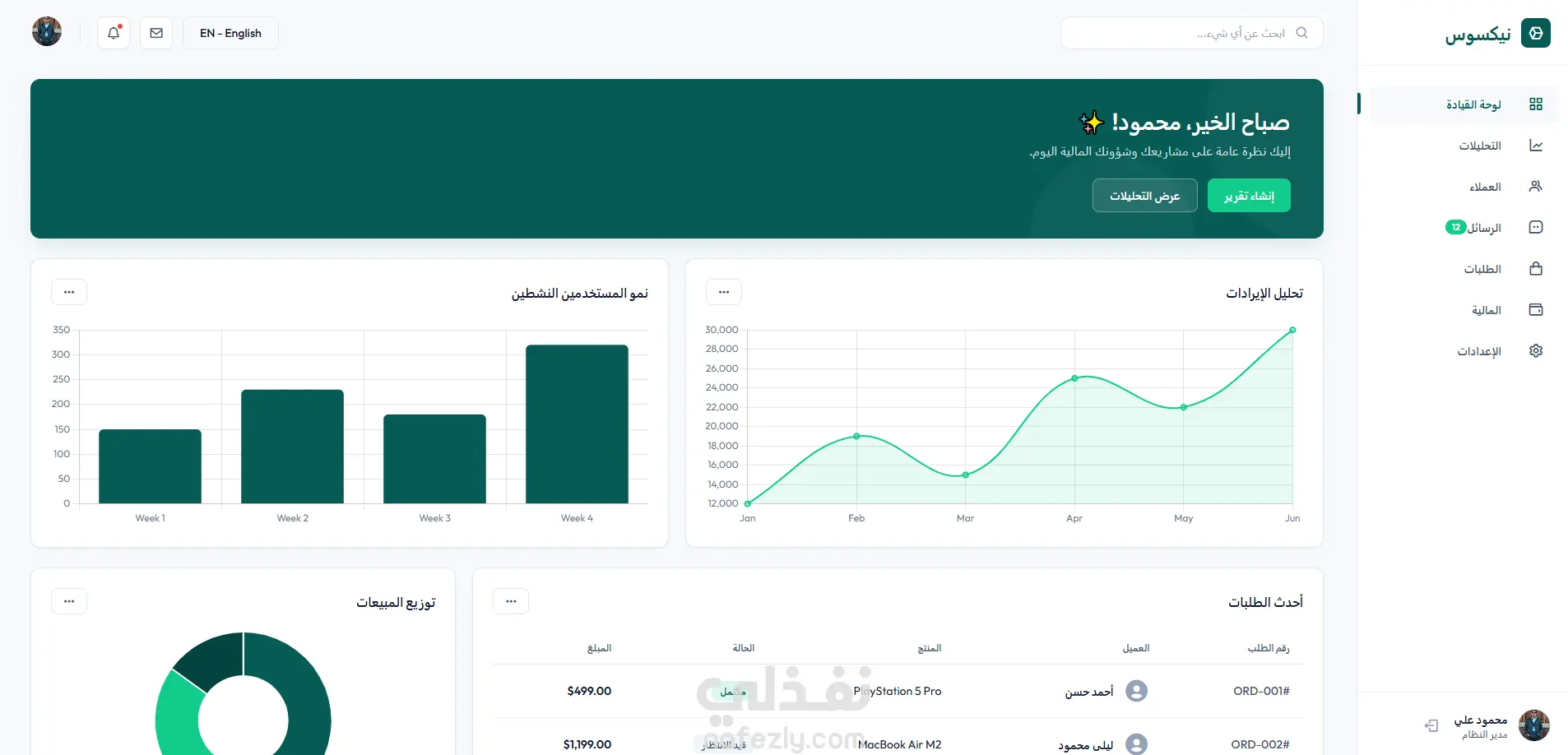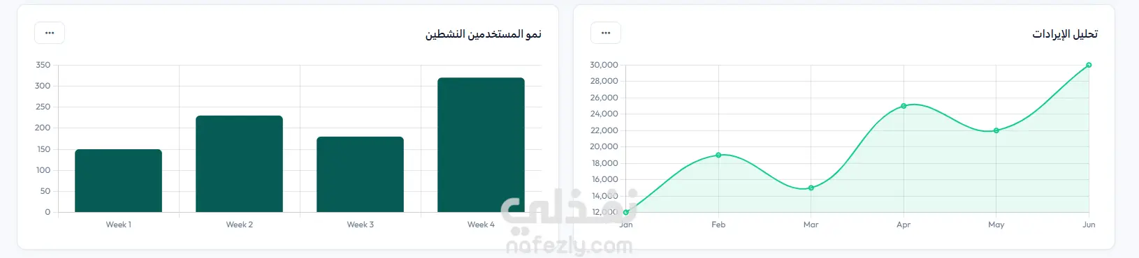 تمثيل بياني متطور (Data Visualization): رسوم بيانية تفاعلية لمتابعة الإيرادات (Revenue Analysis) ونمو المستخدمين (Active Users Growth).