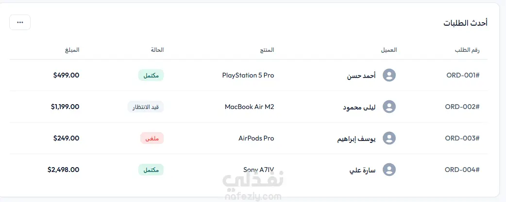 نظام إدارة الطلبات: جدول منظم لعرض تفاصيل الطلبات، الحالة (مكتمل، قيد الانتظار، ملغى)، والأسعار.
