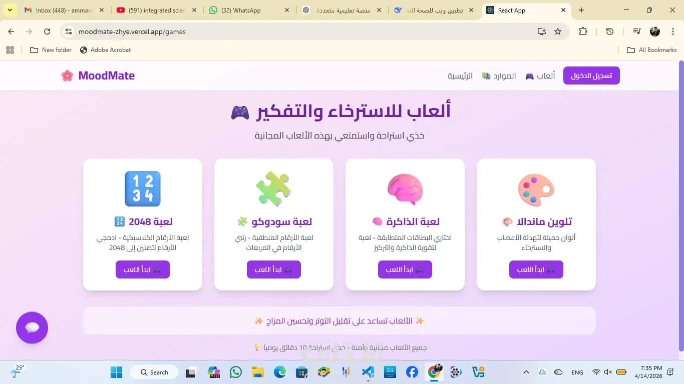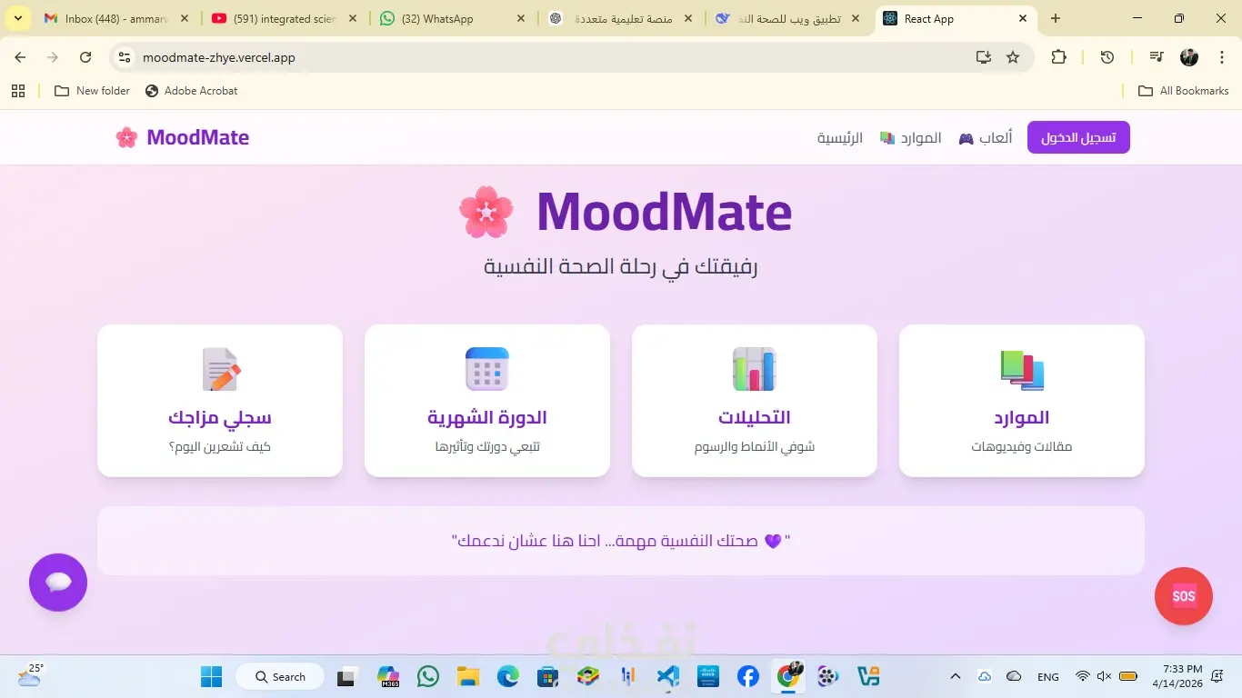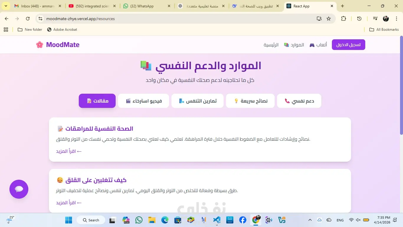 ملخص المشروع MoodMate هو تطبيق ويب لدعم الصحة النفسية للفتيات والمراهقات، يربط بين الحالة النفسية اليومية والدورة الشهرية، ويقدم تحليلات وموارد دعم. الفكرة الأساسية تعاني الفتيات من تقلبات مزاجية مرتبطة بالهرمونات والدورة الشهرية، وغالباً لا يجدن أداة تساعدهن على فهم هذه العلاقة. لذلك صمم MoodMate ليكون داعماً ومسانداً، وليس بديلاً عن الطبيب، وموجهاً تحديداً للفتيات بلغة تناسبهن. أجزاء التطبيق أولاً: تسجيل المزاج تختار الفتاة حالتها من 5 خيارات: سعيدة، حزينة، غضبانة، متعبة، قلقة، مع إمكانية إضافة ملاحظة. يمنع التسجيل أكثر من مرة يومياً. ثانياً: الدورة الشهرية تسجل تاريخ آخر دورة وطول الدورة وأيام الحيض، ويحسب التطبيق تلقائياً الدورة القادمة وأيام الخصوبة والتبويض. ثالثاً: التحليلات يعرض إحصائيات ورسوماً بيانية تشمل إجمالي التسجيلات، أكثر مزاج تكرر، متوسط المزاج، توزيع المشاعر، وجدولاً زمنياً بجميع التسجيلات. رابعاً: الموارد والدعم يضم مقالات عن الصحة النفسية، وتمارين تنفس تفاعلية (4-7-8، التنفس البطني، الزفير الطويل، التنفس المربع)، ونصائح سريعة يومية، وأرقام دعم نفسي مجانية لمصر والسعودية والإمارات والأردن وفلسطين. خامساً: الألعاب يقدم 4 ألعاب مجانية للاسترخاء: 2048، سودوكو، لعبة الذاكرة، تلوين ماندالا. سادساً: شات بوت شات بوت بسيط للفضفضة، يرد بكلمات مفتاحية وبردود داعمة. --- التقنيات المستخدمة React.js للواجهة، Tailwind CSS للتصميم، Firebase للتخزين والتوثيق، Recharts للرسوم البيانية، Vercel للنشر، Git و GitHub للتحكم في الإصدارات. --- التحديات التي تم حلها إنشاء فهرس في Firebase لحل مشكلة ترتيب البيانات في التحليلات، وتحويل روابط الفيديوهات إلى youtube-nocookie لتجنب أخطاء CORS، واستبدال الفيديوهات غير الشغالة بتمارين تنفس، وإضافة رسائل خطأ واضحة لتسجيل الدخول، وإصلاح روابط الألعاب غير الشغالة. --- الأمان والخصوصية يستخدم Firebase Authentication لتسجيل الدخول الآمن، وقواعد أمان مخصصة تمنع المستخدمات من رؤية بيانات بعضهن، وجميع البيانات مشفرة، والتطبيق يعمل عبر HTTPS. --- الإصدارات المستقبلية نظام إشعارات، وضع مظلم، تقارير شهرية، دعم لغات متعددة، وتطبيق موبايل. --- الفريق المنفذ الفكرة: حبيبة محمد رمضان. التنفيذ والتطوير الكامل: محمد رمضان. --- رابط المشروع https://moodmate-zhye.vercel.app --- الخاتمة MoodMate هو رفيق إلكتروني يساعد الفتيات على فهم أنفسهن وتتبع صحتهن النفسية، تم تنفيذه بدقة وأمان، وهو جاهز للاستخدام.