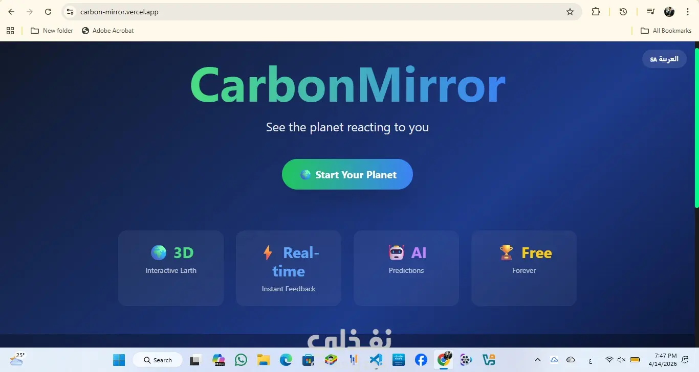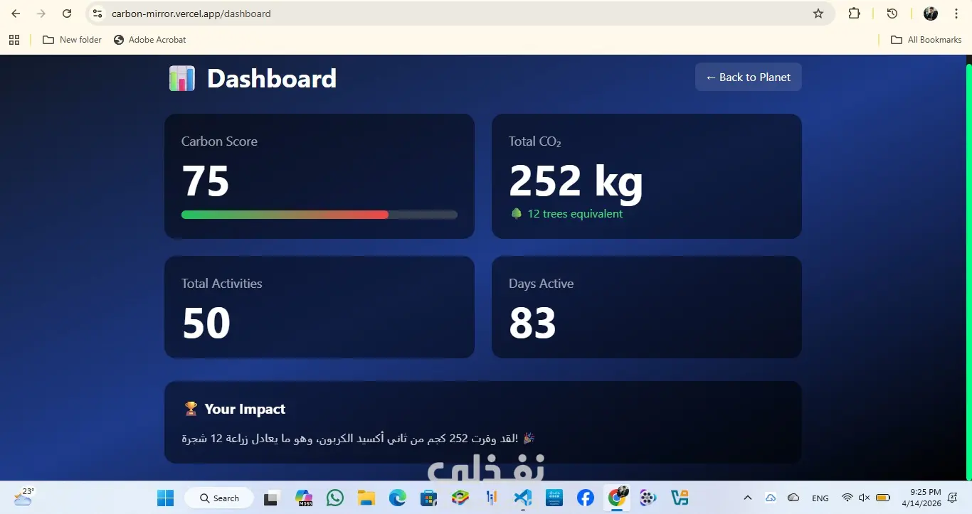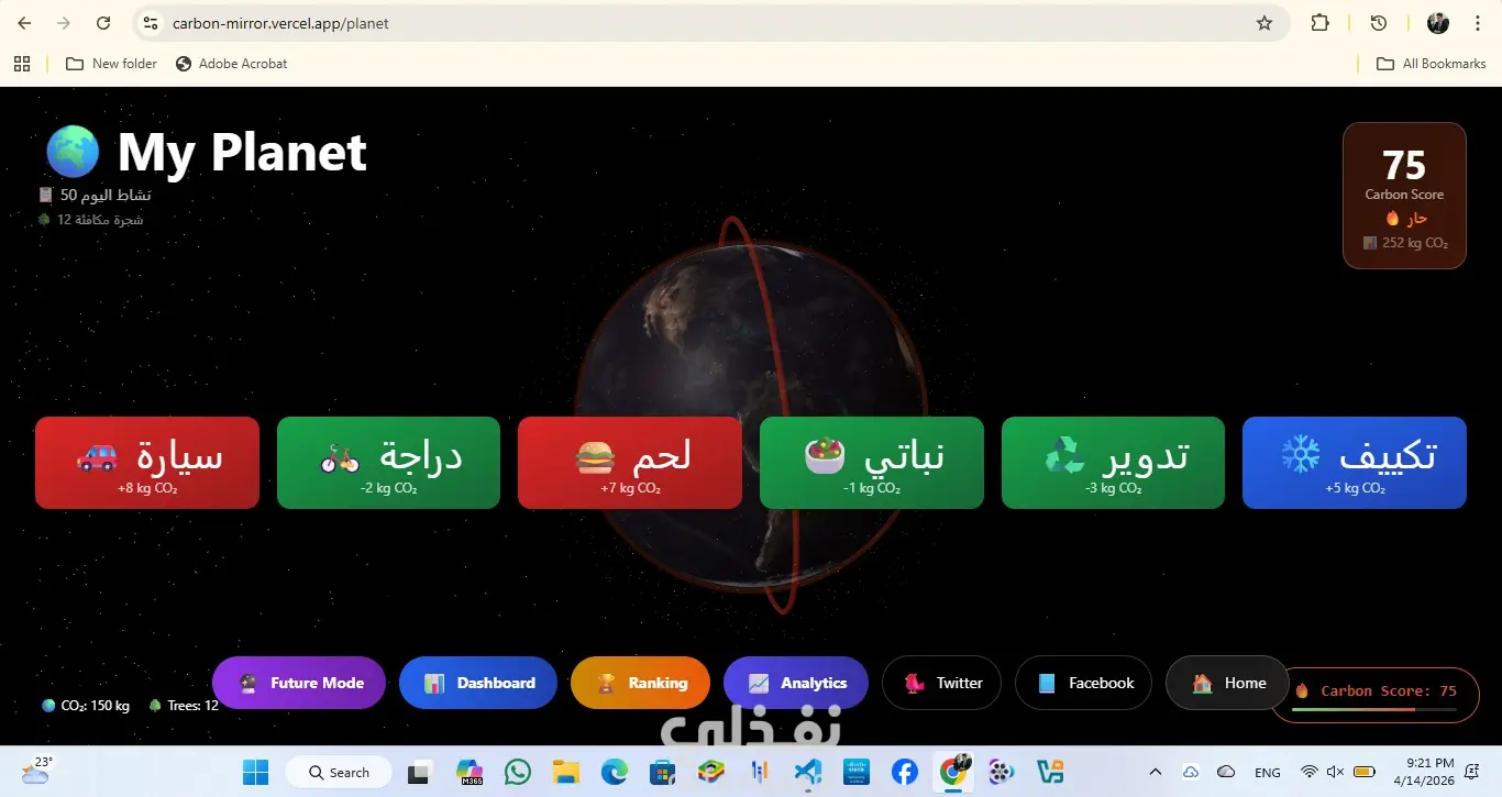 **الحل:** CarbonMirror هو موقع ويب تفاعلي يحول حياة المستخدم اليومية إلى تأثير بيئي مرئي وفوري. كل مستخدم لديه كوكب أرض ثلاثي الأبعاد خاص به يتغير لونه بناءً على قراراته.