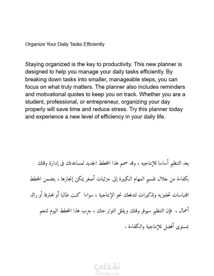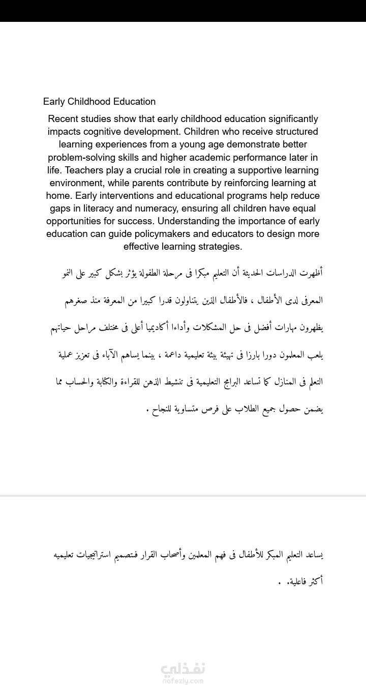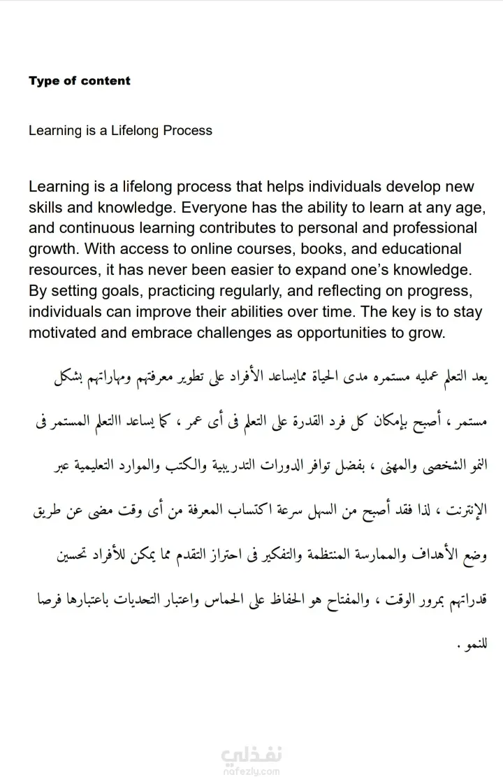قمت بترجمة محتوى من اللغة الإنجليزية إلى العربية بدقة واحترافية، مع الحفاظ على المعنى الأصلي للنص وتقديمه بأسلوب عربي سلس وطبيعي يناسب الجمهور المستهدف. شمل العمل: فهم النص الأصلي بشكل عميق قبل بدء الترجمة نقل المعنى وليس الترجمة الحرفية لضمان جودة المحتوى استخدام مصطلحات دقيقة ومناسبة للسياق مراجعة النص لغويًا وإملائيًا بعد الترجمة تنسيق المحتوى بشكل منظم وجاهز للاستخدام تم تسليم العمل بجودة عالية مع الالتزام بالمواعيد النهائية، مع الحرص على تقديم ترجمة احترافية خالية من الأخطاء وجاهزة للنشر أو الاستخدام المباشر.