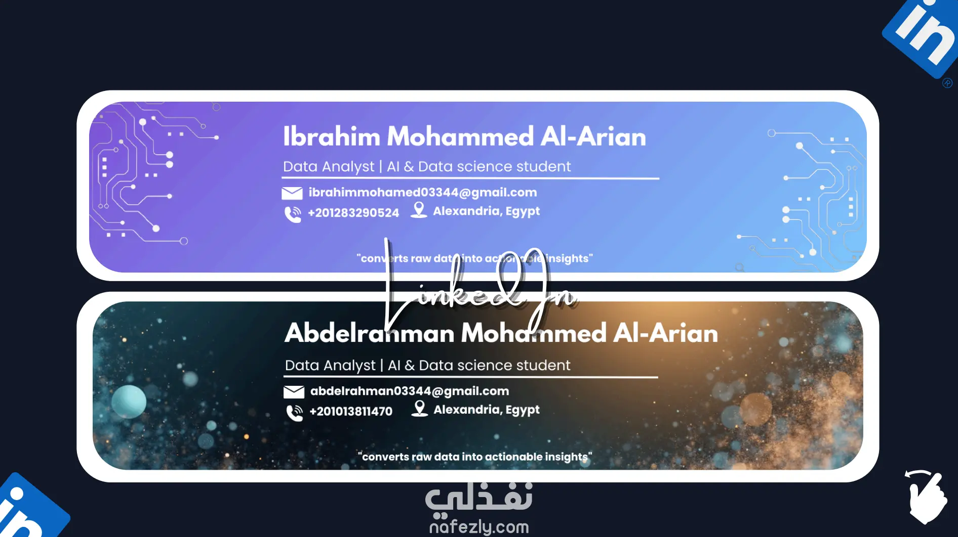 معرض أعمال يحتوي على : +15 تصميم سوشيال ميديا +3 بانر ملف شخصي ( يوتيوب - لينكدان ) +5 أغلفة كتب و مذكرات 1 كارت لبيزنس