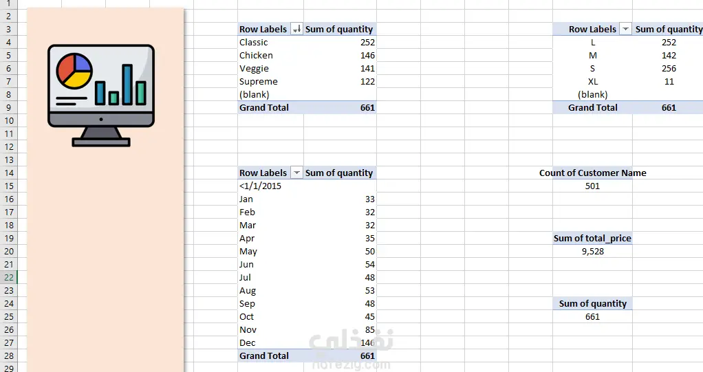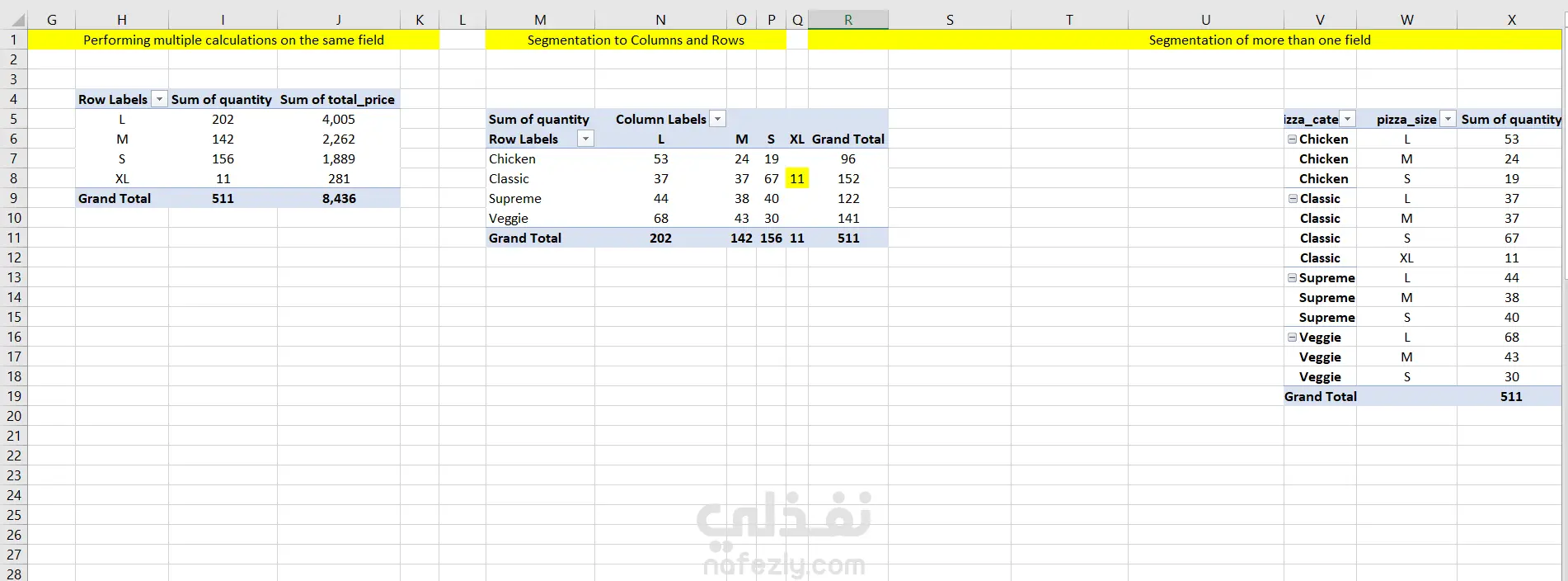 التحليل الاستكشافي (Exploratory Data Analysis): بناء جداول محورية (Pivot Tables) ديناميكية لتلخيص البيانات وتقسيمها بناءً على المتغيرات الأساسية (فئات المنتجات، الأحجام، التواريخ).