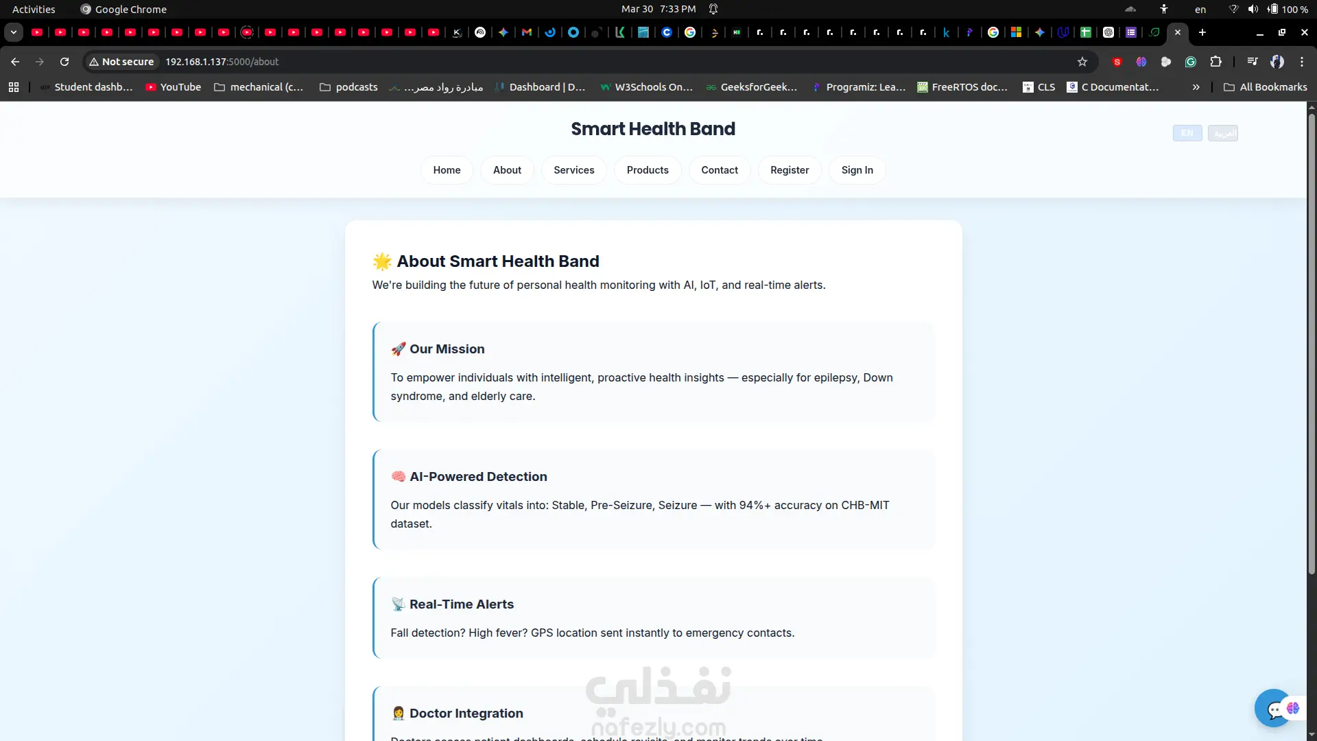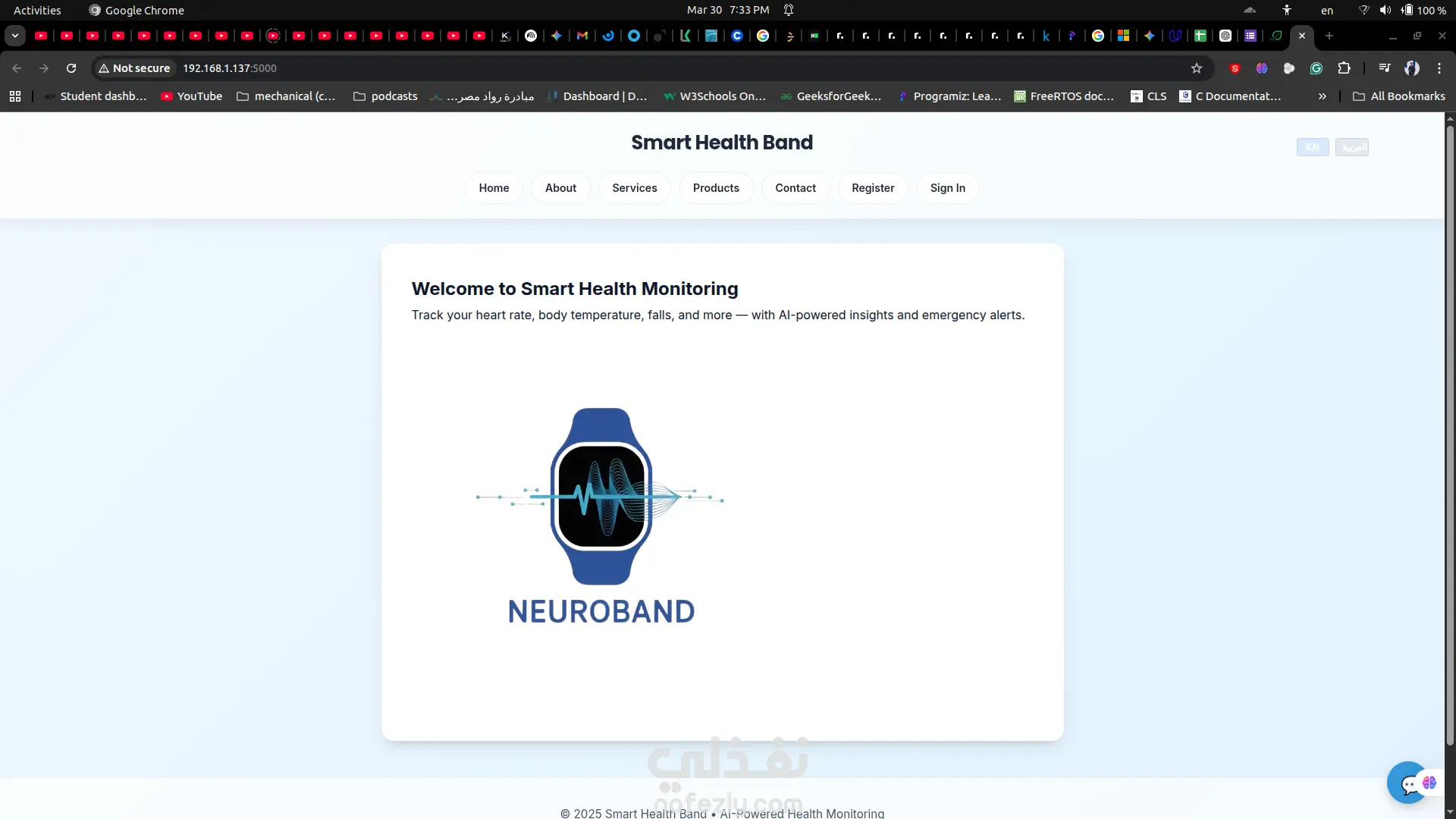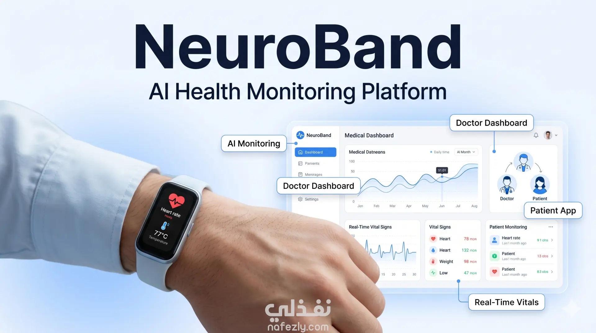 منصة صحية متكاملة بنظام Full-Stack بعنوان **NeuroBand**، تم تطويرها لدعم سوار صحي ذكي يعمل بالذكاء الاصطناعي لمراقبة العلامات الحيوية مثل معدل ضربات القلب، درجة الحرارة، واكتشاف السقوط أو نوبات التشنج. يوضح المشروع قدرتي على بناء حلول HealthTech آمنة تعتمد على نظام الصلاحيات من الصفر مع تجربة استخدام احترافية. تتضمن المنصة نظام بوابتين منفصلتين؛ لوحة تحكم للأطباء تتيح إدارة المواعيد ومتابعة بيانات المرضى، ولوحة للمرضى تعرض الإحصائيات الصحية في الوقت الحقيقي مع تتبع البيانات التاريخية. تم دمج المنصة مع نماذج ذكاء اصطناعي مدمجة داخل السوار الصحي لعرض البيانات بشكل مباشر، بالإضافة إلى شات بوت ذكي يعمل على مدار الساعة لدعم المستخدمين والإجابة على استفساراتهم. كما تحتوي المنصة على موقع تسويقي متجاوب بتصميم Mobile-First وهوية بصرية احترافية. تم تطوير المشروع باستخدام Flask وPython وJavaScript وHTML5/CSS3 مع بنية تخزين خفيفة تعتمد على CSV. هذه المنصة مناسبة لتطوير MVP طبي، أنظمة SaaS، أو تطبيقات ويب مدمجة بالذكاء الاصطناعي.