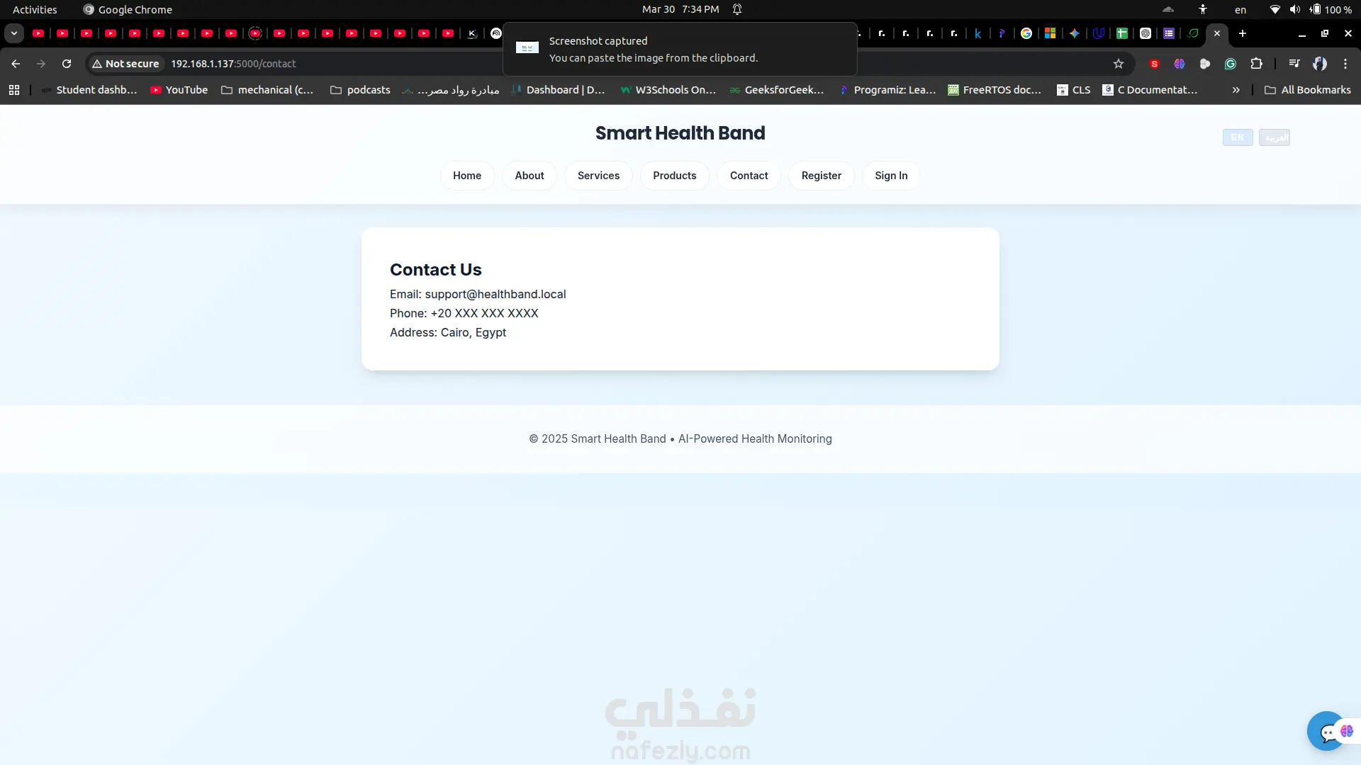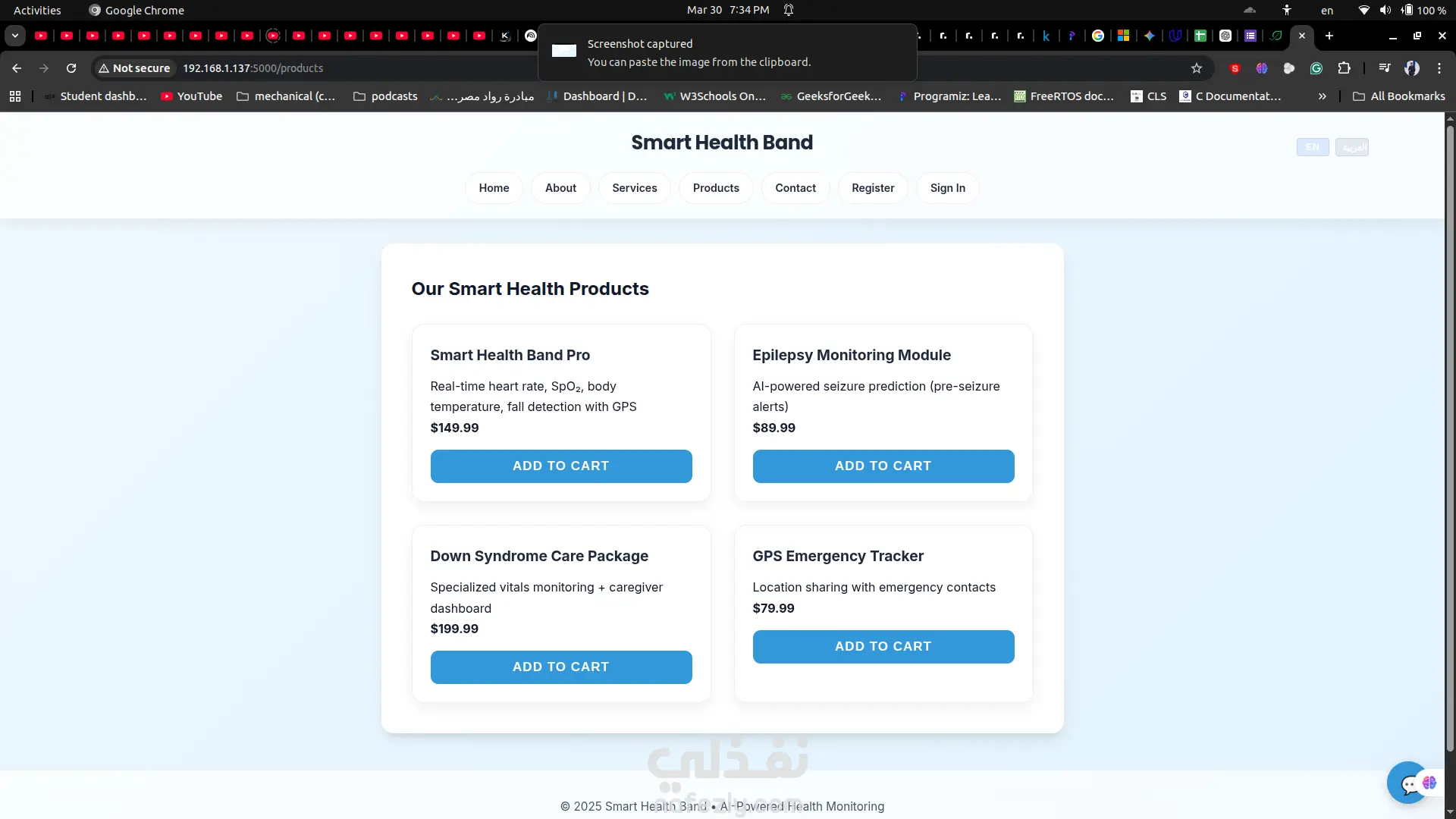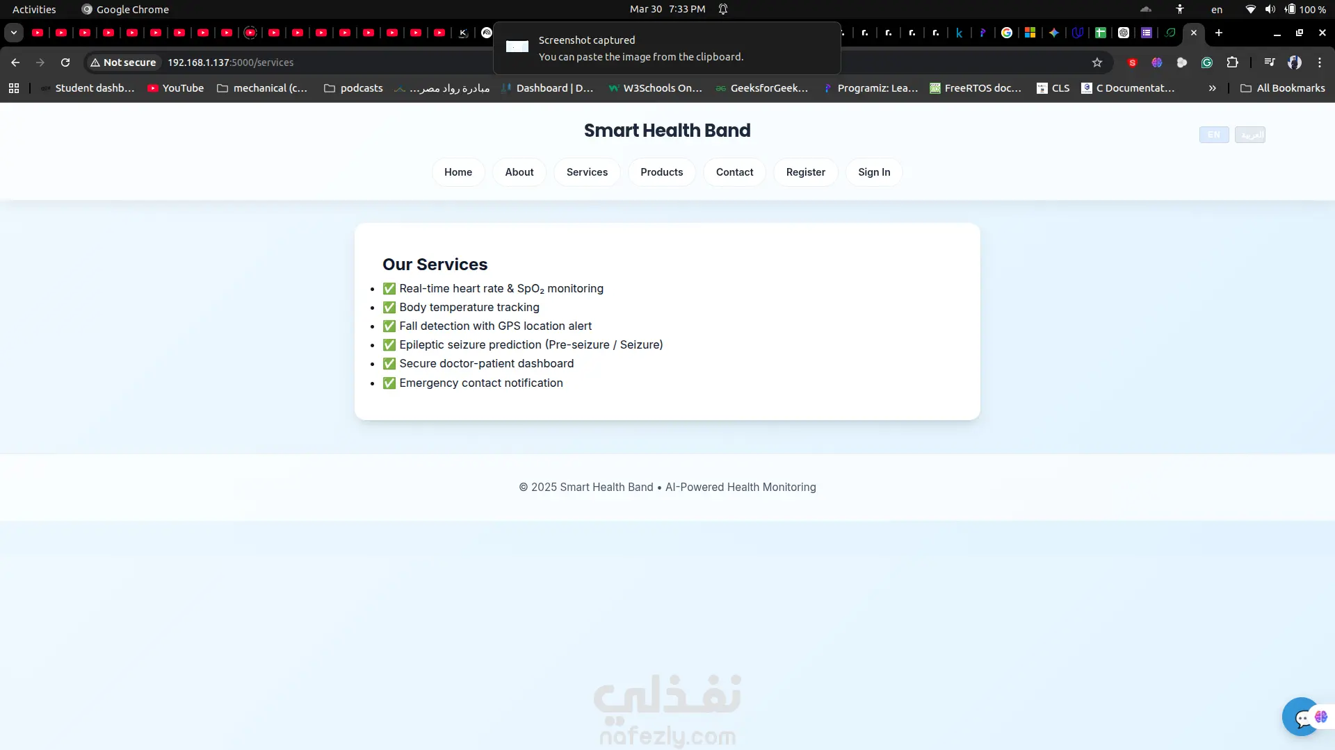 منصة صحية متكاملة بنظام Full-Stack بعنوان **NeuroBand**، تم تطويرها لدعم سوار صحي ذكي يعمل بالذكاء الاصطناعي لمراقبة العلامات الحيوية مثل معدل ضربات القلب، درجة الحرارة، واكتشاف السقوط أو نوبات التشنج. يوضح المشروع قدرتي على بناء حلول HealthTech آمنة تعتمد على نظام الصلاحيات من الصفر مع تجربة استخدام احترافية. تتضمن المنصة نظام بوابتين منفصلتين؛ لوحة تحكم للأطباء تتيح إدارة المواعيد ومتابعة بيانات المرضى، ولوحة للمرضى تعرض الإحصائيات الصحية في الوقت الحقيقي مع تتبع البيانات التاريخية. تم دمج المنصة مع نماذج ذكاء اصطناعي مدمجة داخل السوار الصحي لعرض البيانات بشكل مباشر، بالإضافة إلى شات بوت ذكي يعمل على مدار الساعة لدعم المستخدمين والإجابة على استفساراتهم. كما تحتوي المنصة على موقع تسويقي متجاوب بتصميم Mobile-First وهوية بصرية احترافية. تم تطوير المشروع باستخدام Flask وPython وJavaScript وHTML5/CSS3 مع بنية تخزين خفيفة تعتمد على CSV. هذه المنصة مناسبة لتطوير MVP طبي، أنظمة SaaS، أو تطبيقات ويب مدمجة بالذكاء الاصطناعي.