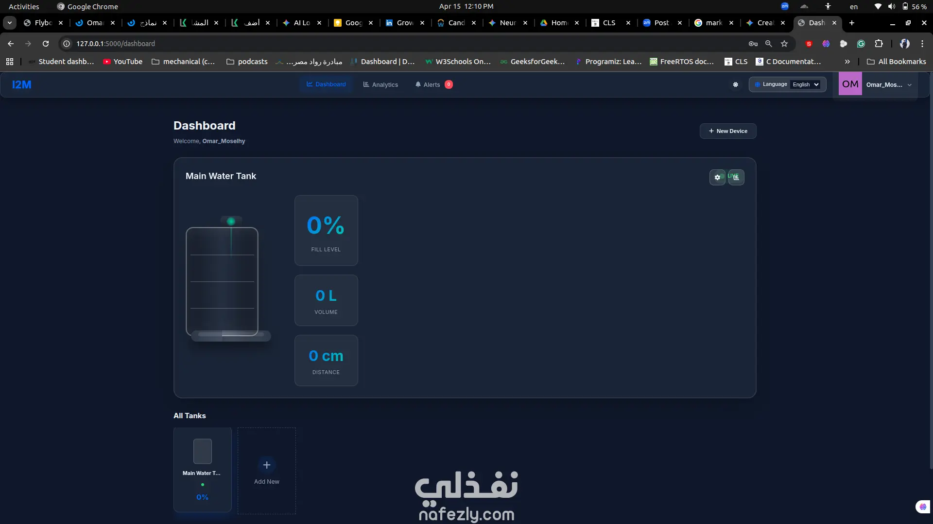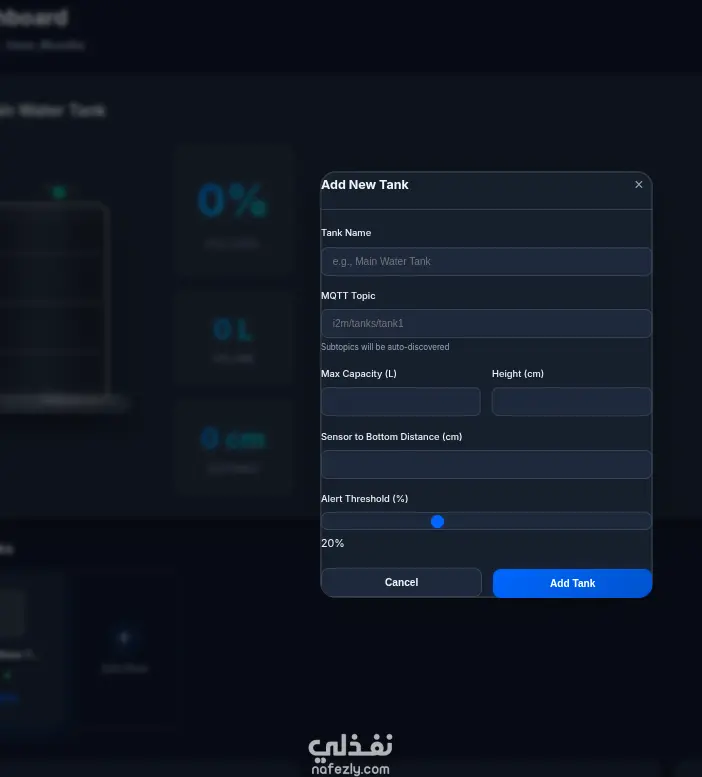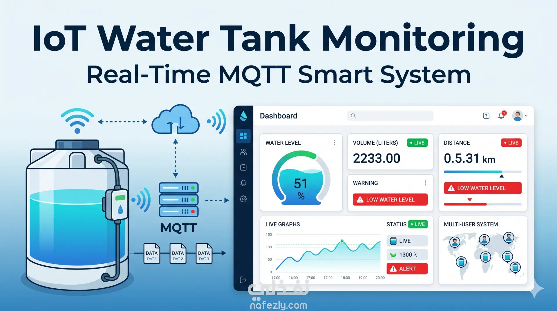 منصة ويب متكاملة تعتمد على إنترنت الأشياء (IoT) لمراقبة مستوى خزان المياه في الوقت الحقيقي باستخدام بروتوكول MQTT مع لوحة تحكم تفاعلية لعرض البيانات. يهدف المشروع إلى توفير نظام قابل للتوسع لإدارة عدة خزانات لمستخدمين مختلفين دون تعارض في البيانات، حيث يمتلك كل مستخدم ملفًا شخصيًا مستقلًا ويمكنه تسجيل أكثر من خزان وربطه عبر MQTT باستخدام Broker وTopic ومعرف الجهاز. بعد الاتصال، يستقبل النظام بيانات الحساسات مباشرة ويعرضها في لوحة تحكم حديثة تشمل نسبة الامتلاء، حجم المياه باللترات، وقياسات المسافة بالسنتيمتر مع تحديثات لحظية. يدعم النظام إدارة متعددة المستخدمين، تسجيل الأجهزة، مؤشرات حالة مباشرة، وتنبيهات عند المستويات الحرجة. تم تطوير المشروع باستخدام HTML وCSS وJavaScript وFlask مع Python وبروتوكول MQTT وبنية تخزين CSV خفيفة. يوضح المشروع قدرتي على بناء تطبيقات ويب مرتبطة بأجهزة IoT، أنظمة بيانات لحظية، ولوحات تحكم تفاعلية قابلة للتوسع للمنازل الذكية والزراعة والحلول الصناعية.