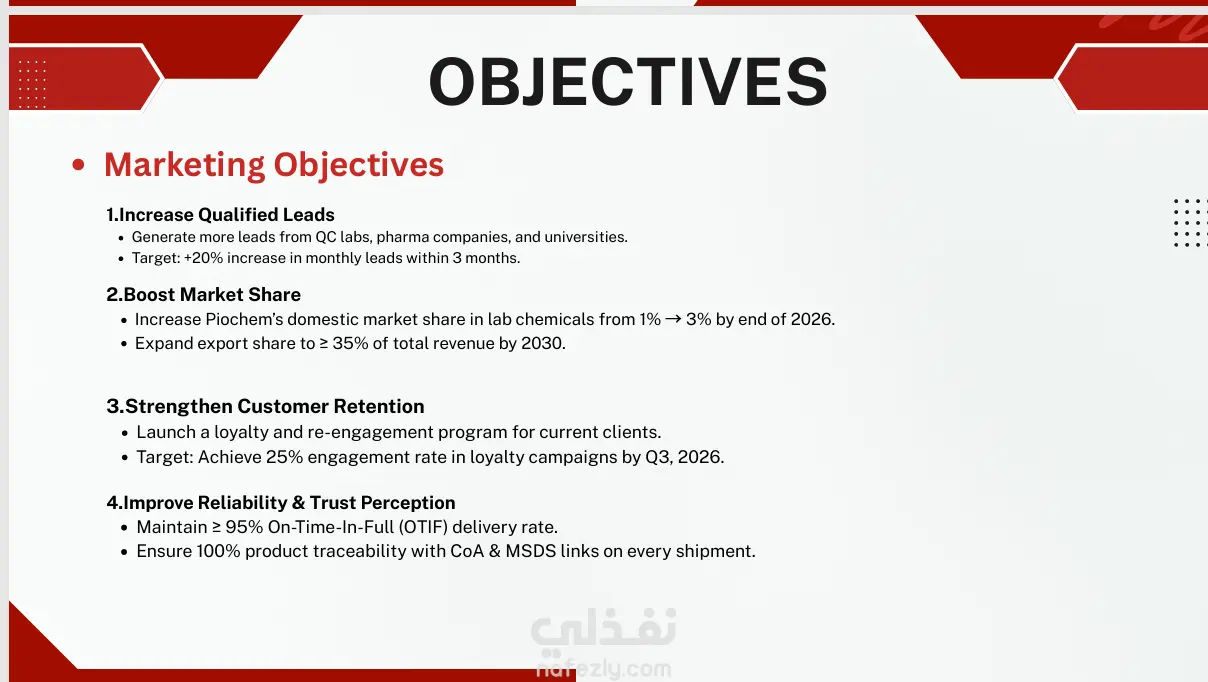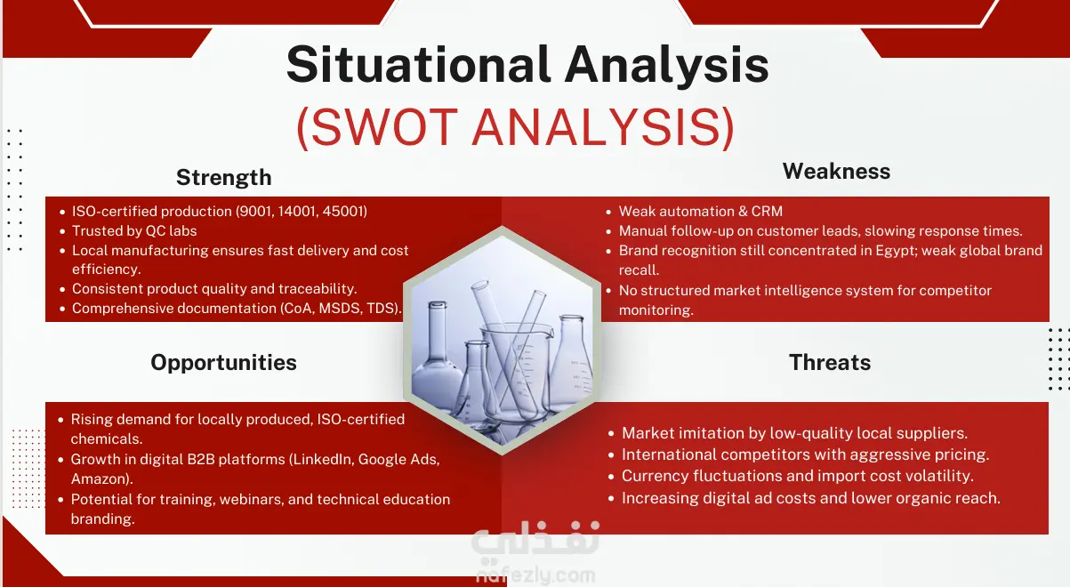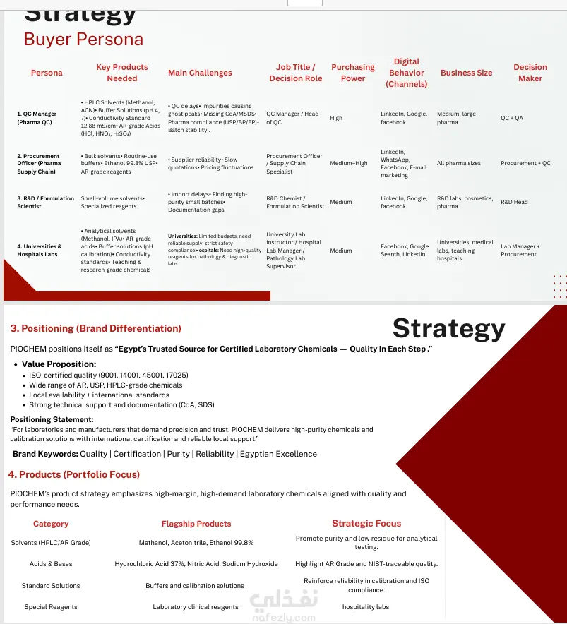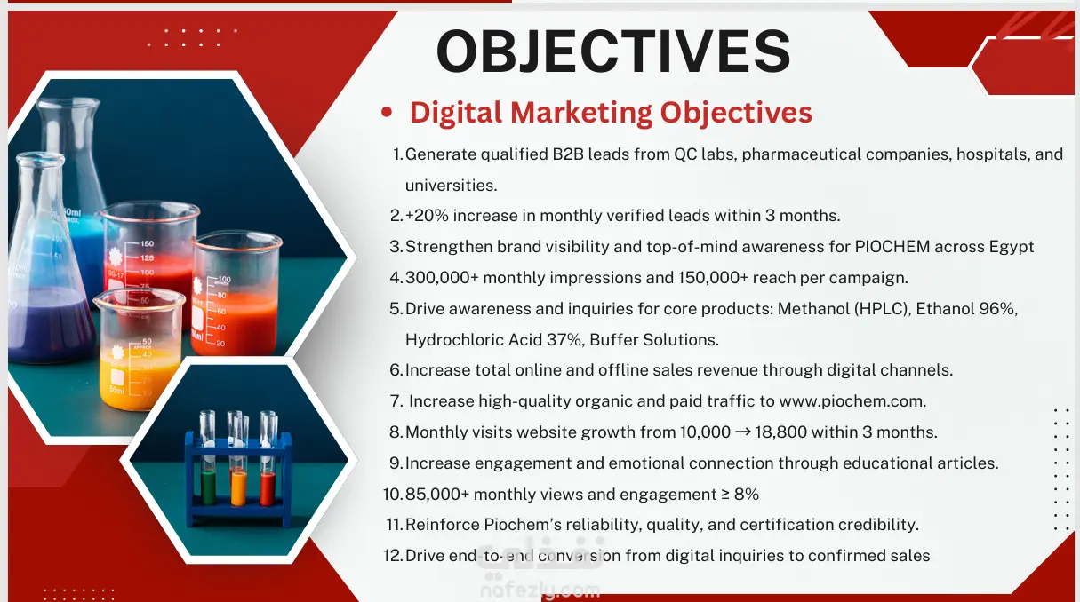 قمت بتطوير استراتيجية تسويق B2B متكاملة لشركة متخصصة في توريد الكيماويات المعملية والصناعية، بهدف تعزيز حضور الشركة في السوق، زيادة الوعي بالعلامة التجارية، ودعم النمو التجاري. اعتمدت في بناء الاستراتيجية على نموذج التخطيط التسويقي SOSTAC، مما ساعد على تنظيم كل خطوات التسويق بدءًا من تحليل السوق وحتى التنفيذ العملي باستخدام Marketing Funnel لتحويل الأنشطة إلى عملاء محتملين ومبيعات فعلية. دوري في المشروع: • تحليل شامل للسوق المنافس وتحديد الشرائح المستهدفة الرئيسية: المعامل، شركات الأدوية، والمصانع الصناعية. • تحديد أهداف تسويقية واضحة ومؤشرات أداء (KPIs) لقياس فعالية كل قناة تسويقية. • تصميم استراتيجية تموضع (B2B Positioning) لرفع مصداقية العلامة التجارية وتعزيز وعي العملاء بالشركة. • إعداد خطة محتوى رقمي متعددة القنوات (LinkedIn، Email Marketing، حملات المنتجات) مرتبطة بالـ Marketing Funnel لتحويل الجمهور إلى عملاء محتملين. • إعداد خارطة تنفيذية لدعم فريق المبيعات وتحقيق أقصى استفادة من الأنشطة التسويقية. النتائج التي حققتها الخطة: • زيادة عدد المتابعين على وسائل التواصل إلى 15,000 متابع. • تعزيز Branding وPositioning للشركة في السوق السعودي. • ارتفاع عدد زوار الموقع الإلكتروني إلى 21,000 زائر شهريًا. • تضاعف مبيعات الموقع الإلكتروني 3 مرات بعد تطبيق الخطة. • توليد 2,100 عميل محتمل (Leads) باستخدام الـ Marketing Funnel بشكل فعال. هذا المشروع يعكس قدرتي على بناء استراتيجيات تسويق B2B عملية وقابلة للقياس، ودمج التخطيط الاستراتيجي مع التنفيذ الرقمي لتحقيق نمو حقيقي وملموس للشركة.