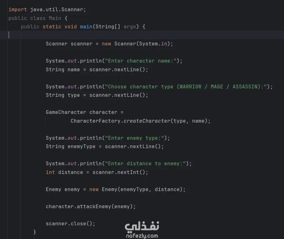هذا المشروع عبارة عن لعبة بسيطة تم تطويرها باستخدام لغة Java، حيث يقوم المستخدم بإنشاء شخصية (Character) واختيار نوعها، ثم مواجهة عدو (Enemy) وتنفيذ الهجوم بناءً على خصائص كل شخصية.
