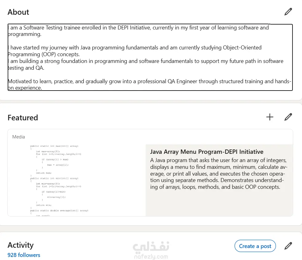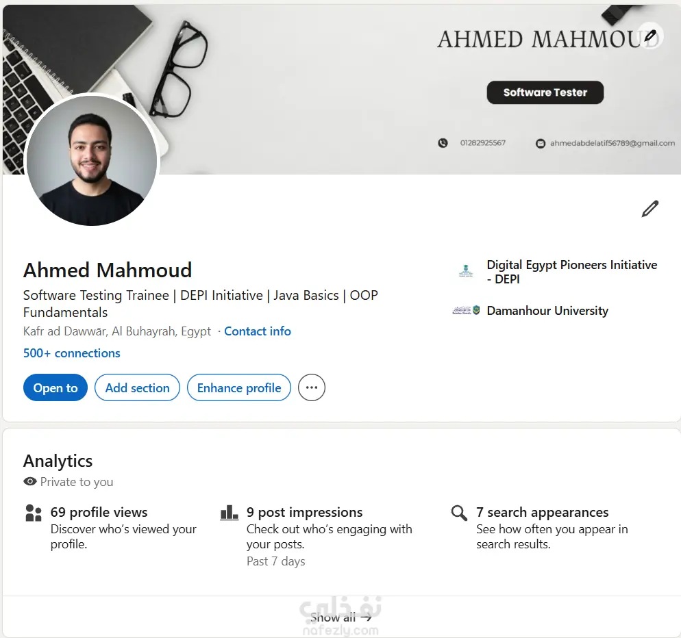 قمت بتحسين حسابي الشخصي على LinkedIn ليظهر بشكل احترافي يعكس مهاراتي وخبراتي بشكل واضح وجذاب لأصحاب العمل. يحتوي الحساب على: كتابة نبذة احترافية (About) تعبر عن شخصيتي ومهاراتي. تحسين العنوان الوظيفي (Headline) لزيادة الظهور في نتائج البحث. تنظيم قسم الخبرات (Experience) بشكل احترافي. إضافة وتنسيق المهارات (Skills) بما يتناسب مع المجال المستهدف. تحسين الشكل العام للبروفايل ليكون أكثر جذبًا واحترافية.