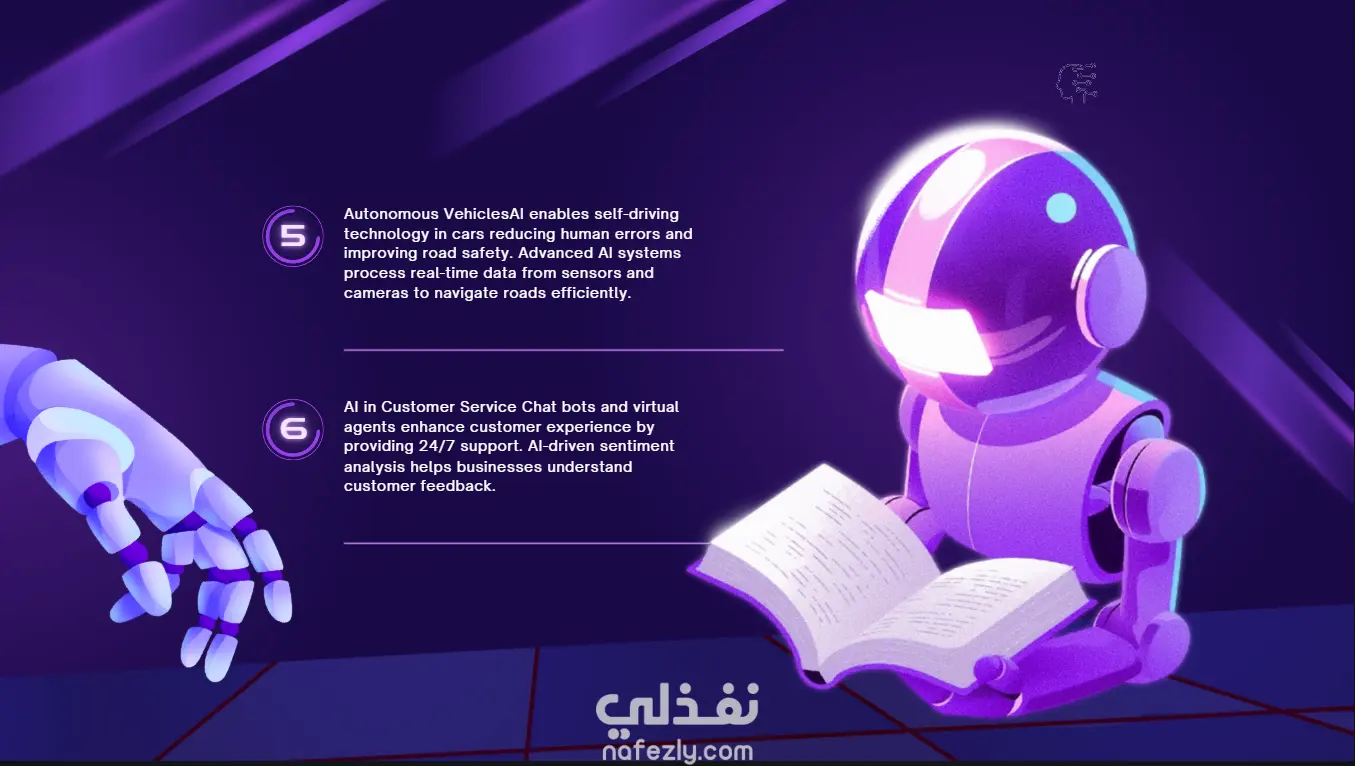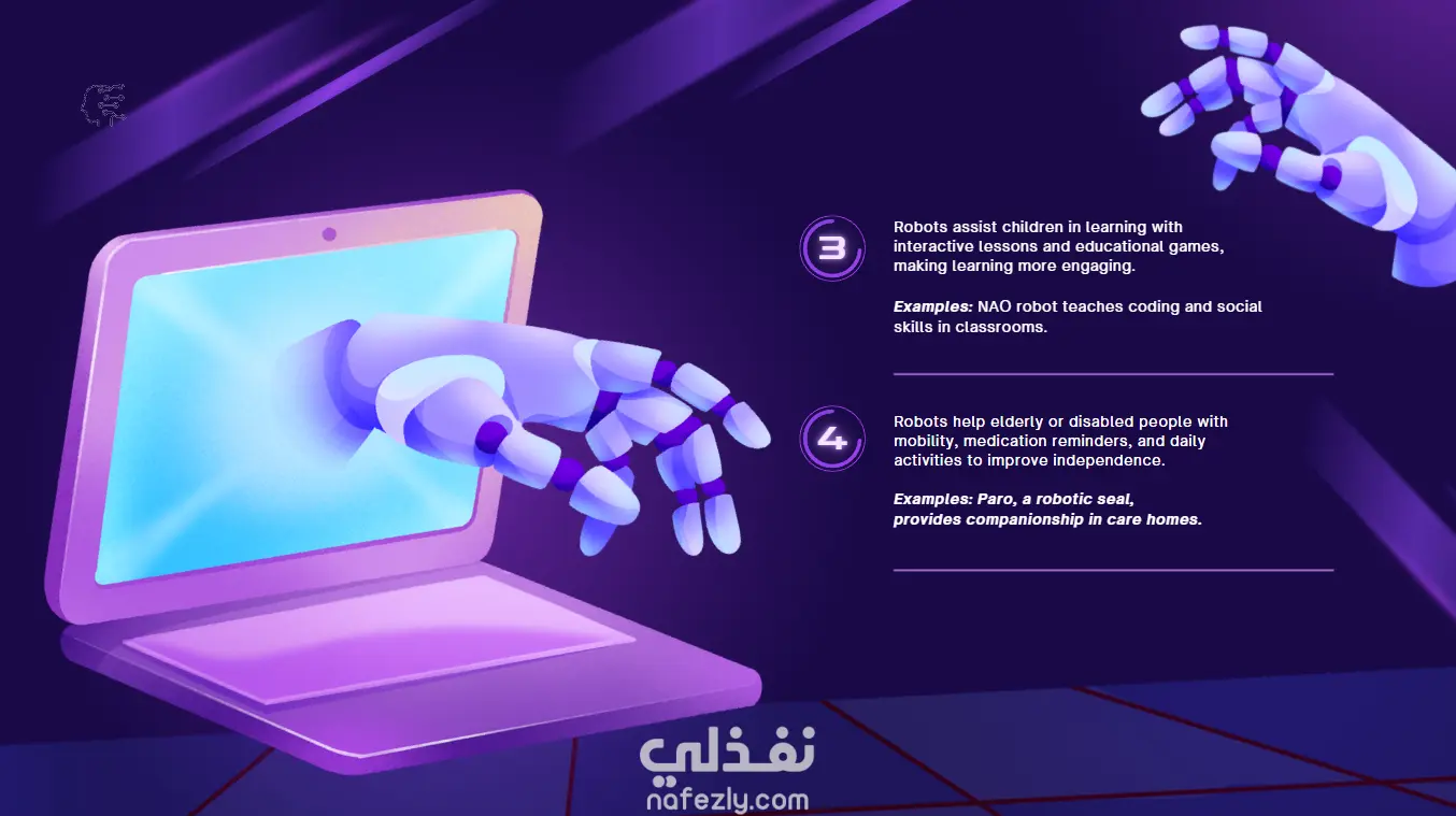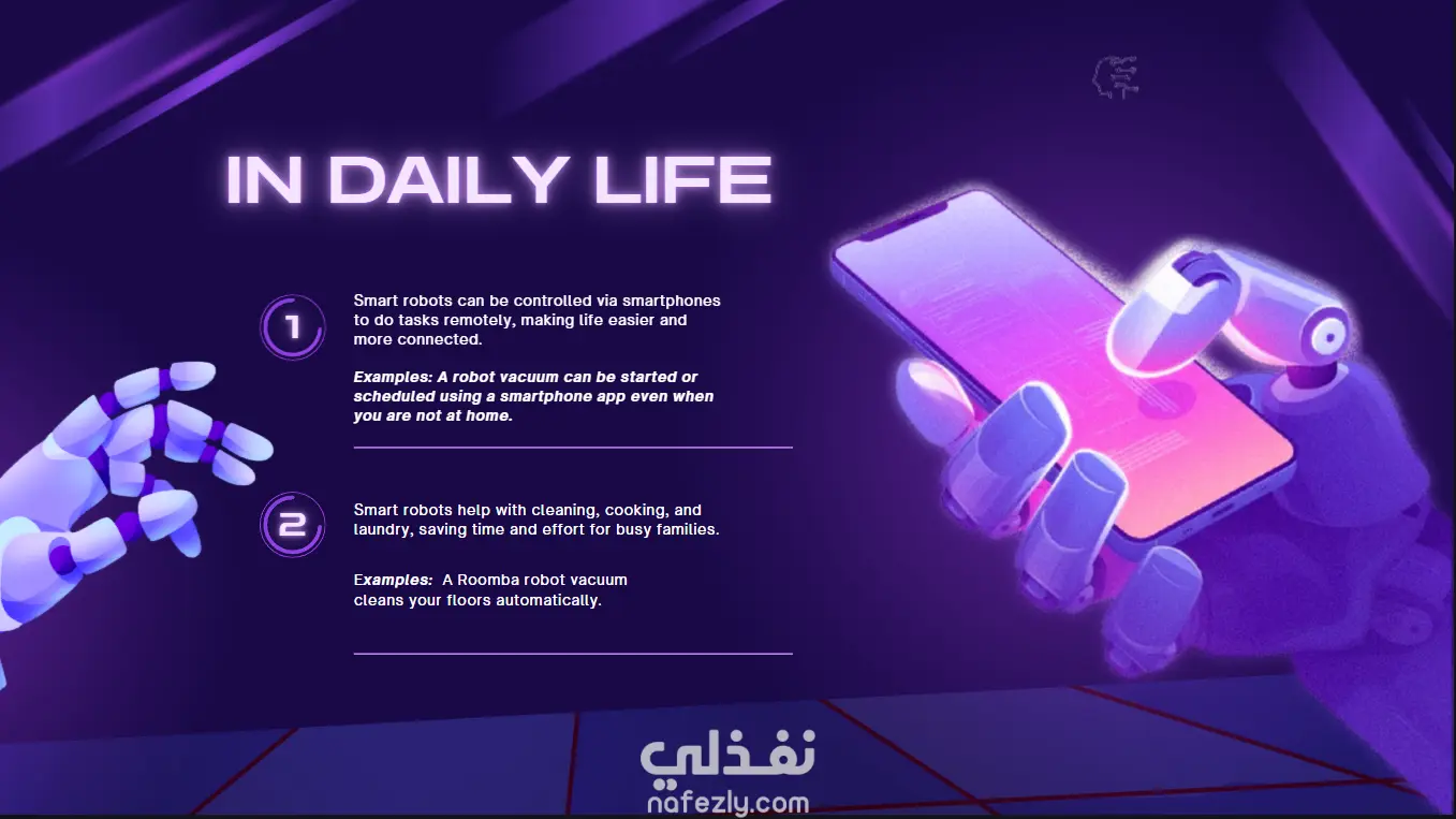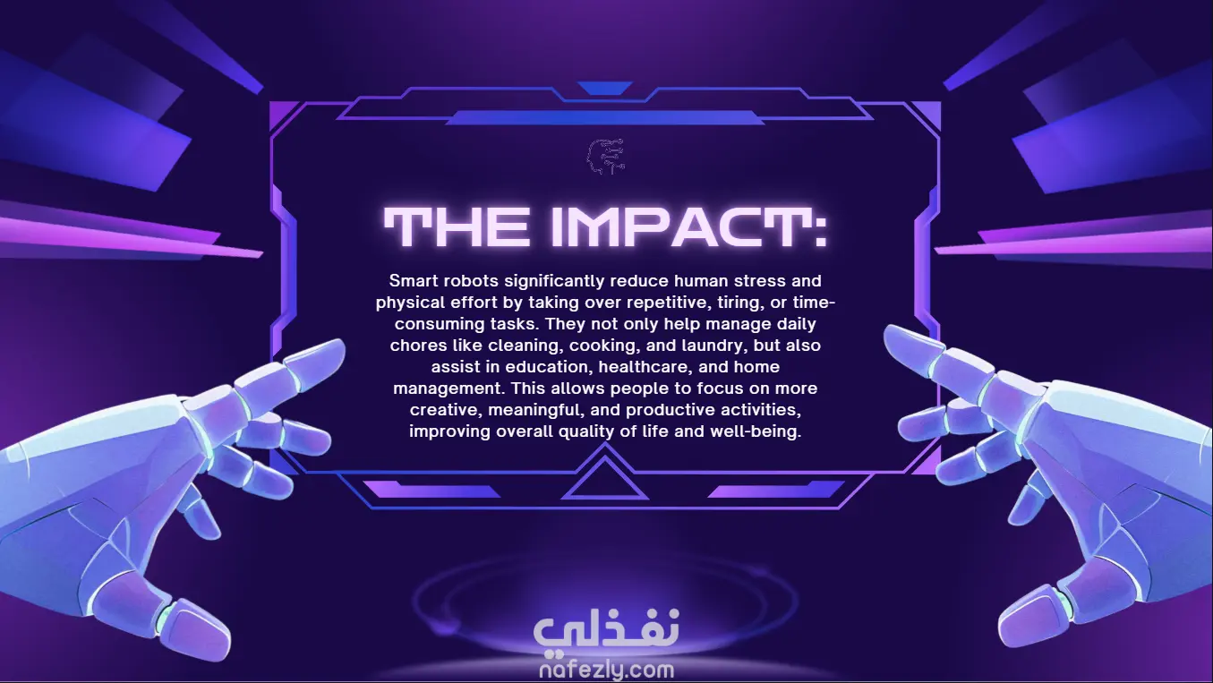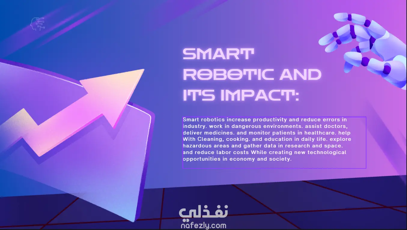 تم تصميم هذا العرض التقديمي باستخدام برنامج PowerPoint , Canva حول موضوع الذكاء الاصطناعي والروبوتات (AI Robots)، بهدف توضيح فكرة تطور تقنيات الذكاء الاصطناعي ودور الروبوتات في المستقبل بطريقة مبسطة وجذابة. تم التركيز على تقديم المحتوى بشكل منظم ومتسلسل يساعد على فهم الفكرة الأساسية للموضوع، بدءًا من تعريف الذكاء الاصطناعي وصولًا إلى تطبيقاته في مجال الروبوتات. تم استخدام عناصر بصرية مرتبطة بالموضوع مثل صور ورسومات الروبوتات لتدعيم المحتوى وإضافة طابع تقني حديث على العرض، مع مراعاة التناسق في الألوان والخطوط داخل الشرائح لإعطاء مظهر احترافي وجذاب.
