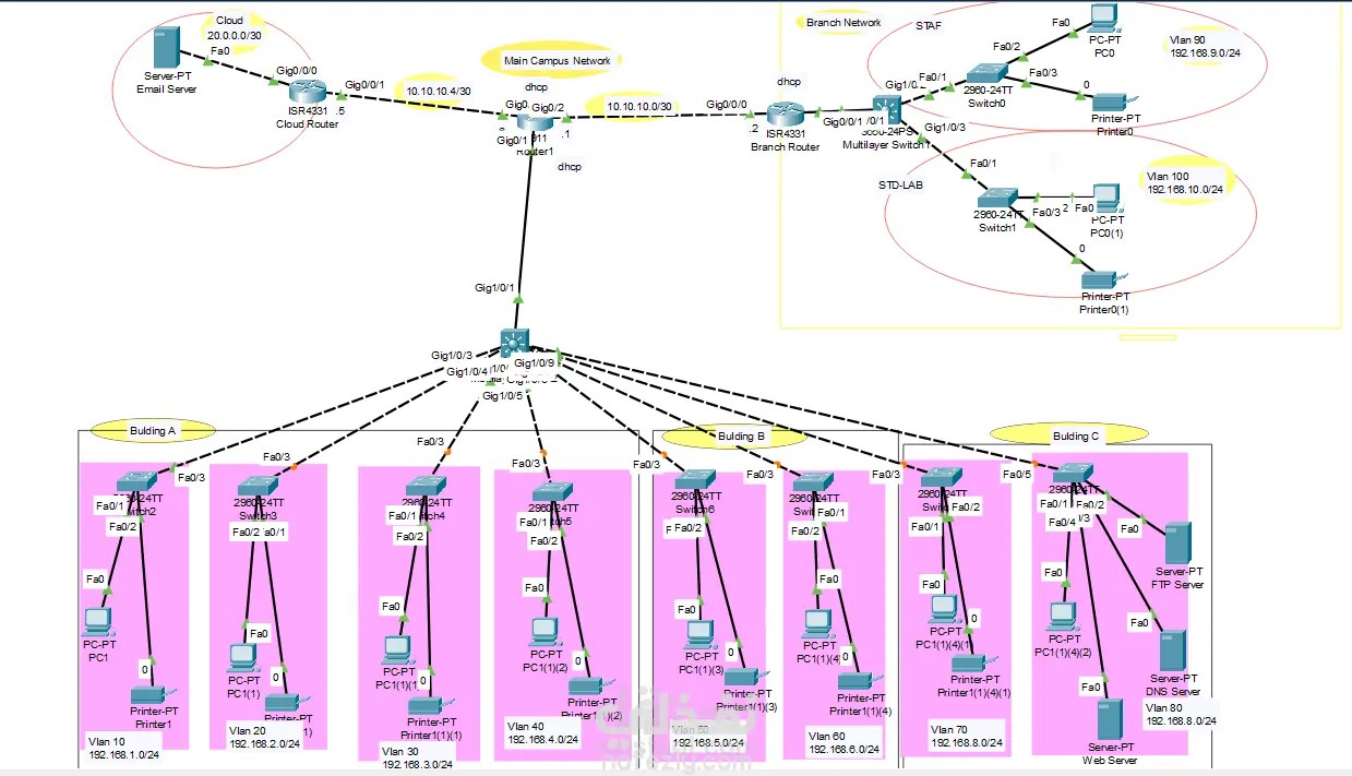 Design and Implementation of a Campus/University System Network Design University which has two campuses situated 20 miles apart. The university’s students and staff are distributed in 4 faculties; these include the faculties of Health and Sciences; Business; Engineering/Computing and Art/Design. Each member of staff has a PC and students have access to PCs in the labs. Create a network topology with the main components to support the following: University location. Main Campus - Building A: Administrative staff in the departments of management, HR and finance. The admin staff PCs are distributed in the building offices and it is expected that they will share some networking equipment (Hint: use of VLANs is expected here). The Faculty of Business is also situated in this building - Building B: Faculty of Engineering and Computing and Faculty of Art and Design. - Building C: Students’ labs and IT department. The IT department hosts the University Web server and other servers - There is also an email server hosted externally on the cloud. Smaller campus: Faculty of Health and Sciences (staff and students’ labs are situated on separate floors) Each department/faculty is expected to be on its own separate IP network. The switches should be configured with appropriate VLANs and security settings. Routing Protocol will be used to provide routing for the routers in the internal network and static routing for the external server. The devices in building A will be expected to acquire dynamic IP addresses from a router-based DHCP server. Configure in Packet Tracer the network with appropriate settings to achieve the connectivity and functionalities specified in the requirements. Technologies Implemented Creating a network topology using Cisco Packet Tracer. 1. Hierarchical Network Design. 2. Connecting Networking devices with Correct cabling. 3. Creating VLANs and assigning ports VLAN numbers. 4. Subnetting and IP Addressing. 5. Configuring Inter-VLAN Routing (Router on a stick). 6. Configuring DHCP Server (Router as the DHCP Server). 7. Configuring SSH for secure Remote access. 8. Configuring any routing protocol. 9. Configuring switchport security or Port-Security on the switches. 10. Host Device Configurations. 11. Test and Verifying Network Communication.