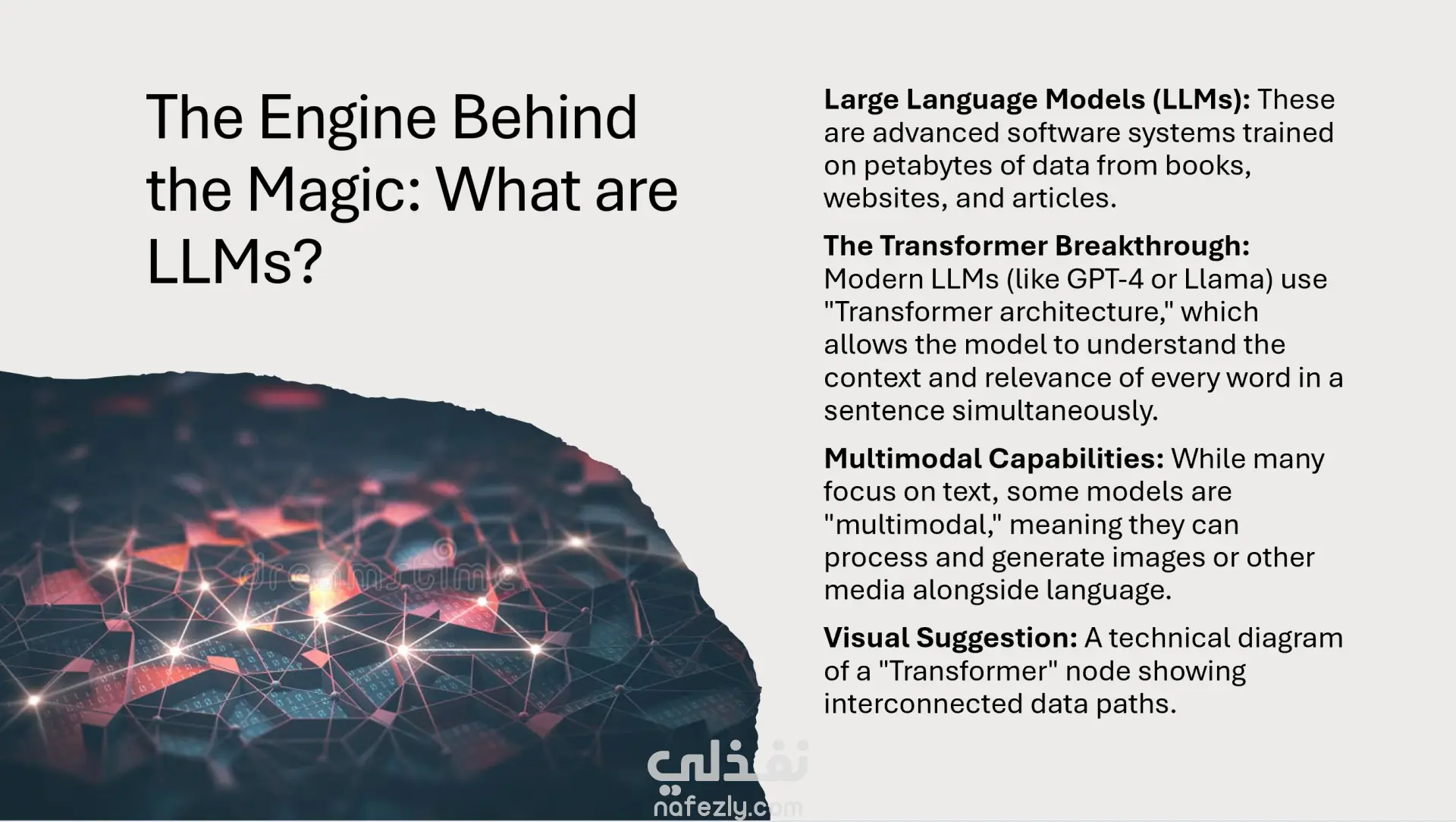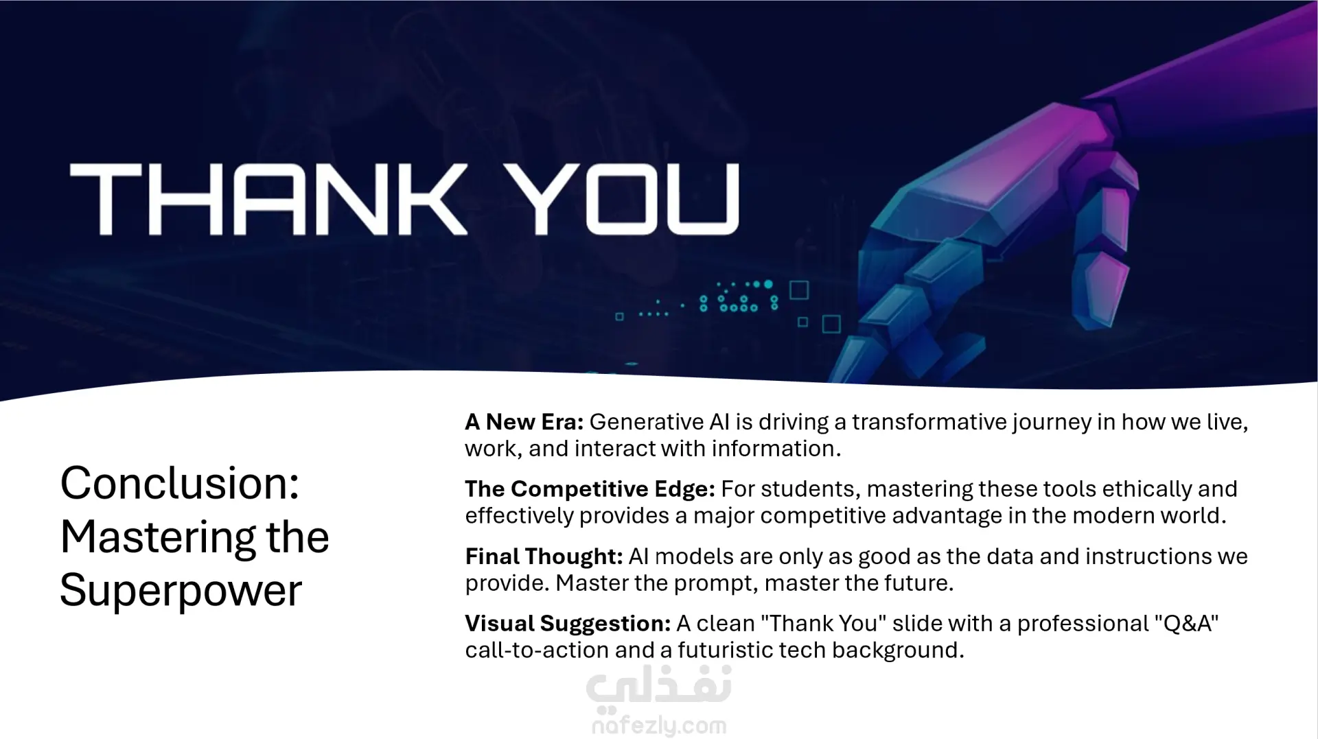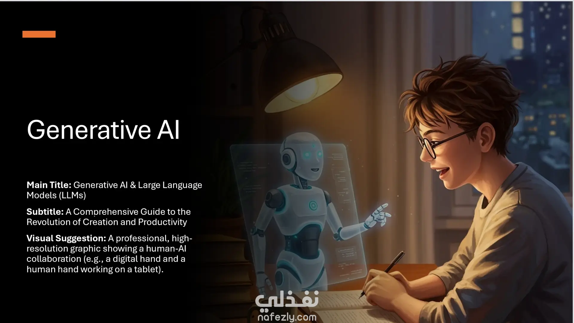 تنفيذ وتصميم عرض تقديمي (Presentation) شامل باللغة الإنجليزية، يهدف إلى تبسيط مفاهيم "الذكاء الاصطناعي التوليدي" (Generative AI) ونماذج اللغة الكبيرة (LLMs). تم إعداد هذا العرض ليكون دليلاً شاملاً وموجهاً خصيصاً للطلاب لمساعدتهم على فهم هذه الثورة التكنولوجية بأسلوب سلس وممتع.الهدف من العمل:تحويل المعلومات التقنية المعقدة إلى محتوى بصري ونصّي سهل الاستيعاب، مع تقديم تحليل موضوعي يسلط الضوء على الإيجابيات والسلبيات، لتوعية الطلاب بكيفية استخدام هذه الأدوات بمسؤولية.مميزات وتفاصيل العمل:هيكلة منطقية وسرد جذاب: تم تقسيم العرض إلى 10 شرائح متسلسلة تأخذ المتلقي في رحلة تبدأ من فهم الأساسيات والفارق بين الذكاء التقليدي والتوليدي ، مروراً بآلية عمل الـ LLMs.تغطية شاملة ومحايدة: استعراض الفوائد الأكاديمية (مثل المساعدة في البرمجة والترجمة وتلخيص المهام) ، ومناقشة التحديات بشفافية (مثل هلوسة الذكاء الاصطناعي ، التحيز ، ومخاطر الخصوصية وحقوق النشر ).دعم بصري احترافي: دمج صور توضيحية ومفاهيمية (Conceptual Art) عالية الجودة لربط النص بالصورة ، مما يسهل إيصال الفكرة المعقدة بمجرد النظر.صياغة أكاديمية مبسطة: كتابة المحتوى بلغة إنجليزية دقيقة، واضحة، ومناسبة للمستوى الأكاديمي، مع ختام العرض بقائمة لأفضل الممارسات الأخلاقية (Best Practices).الأدوات المستخدمة:Microsoft PowerPointأدوات البحث وصياغة المحتوى باللغة الإنجليزيةهذا العمل يثبت قدرتي على استلام مادة علمية معقدة، تلخيصها، هيكلتها، وإخراجها في عرض تقديمي جاهز للتسليم والشرح بأسلوب يجذب الانتباه ويحقق الهدف التعليمي أو المهني المطلوب.