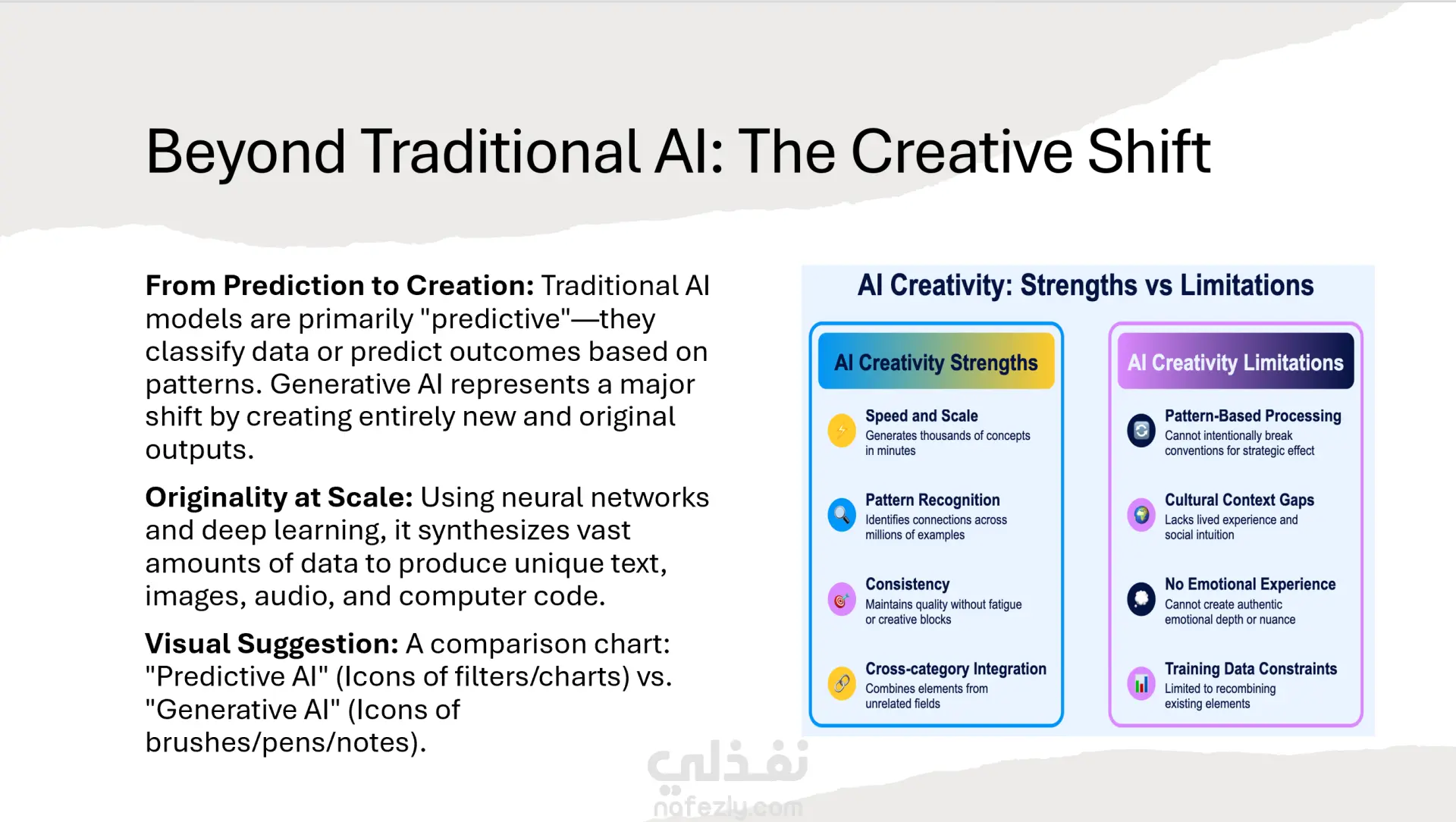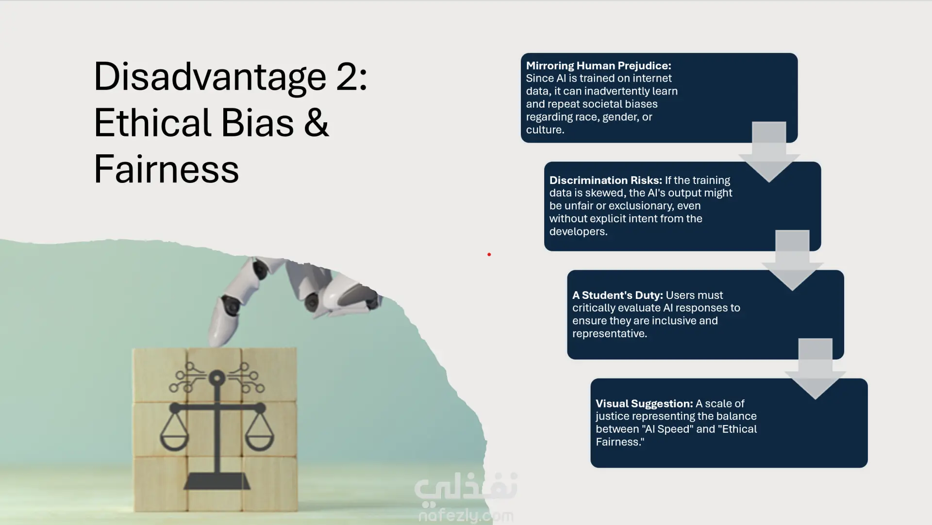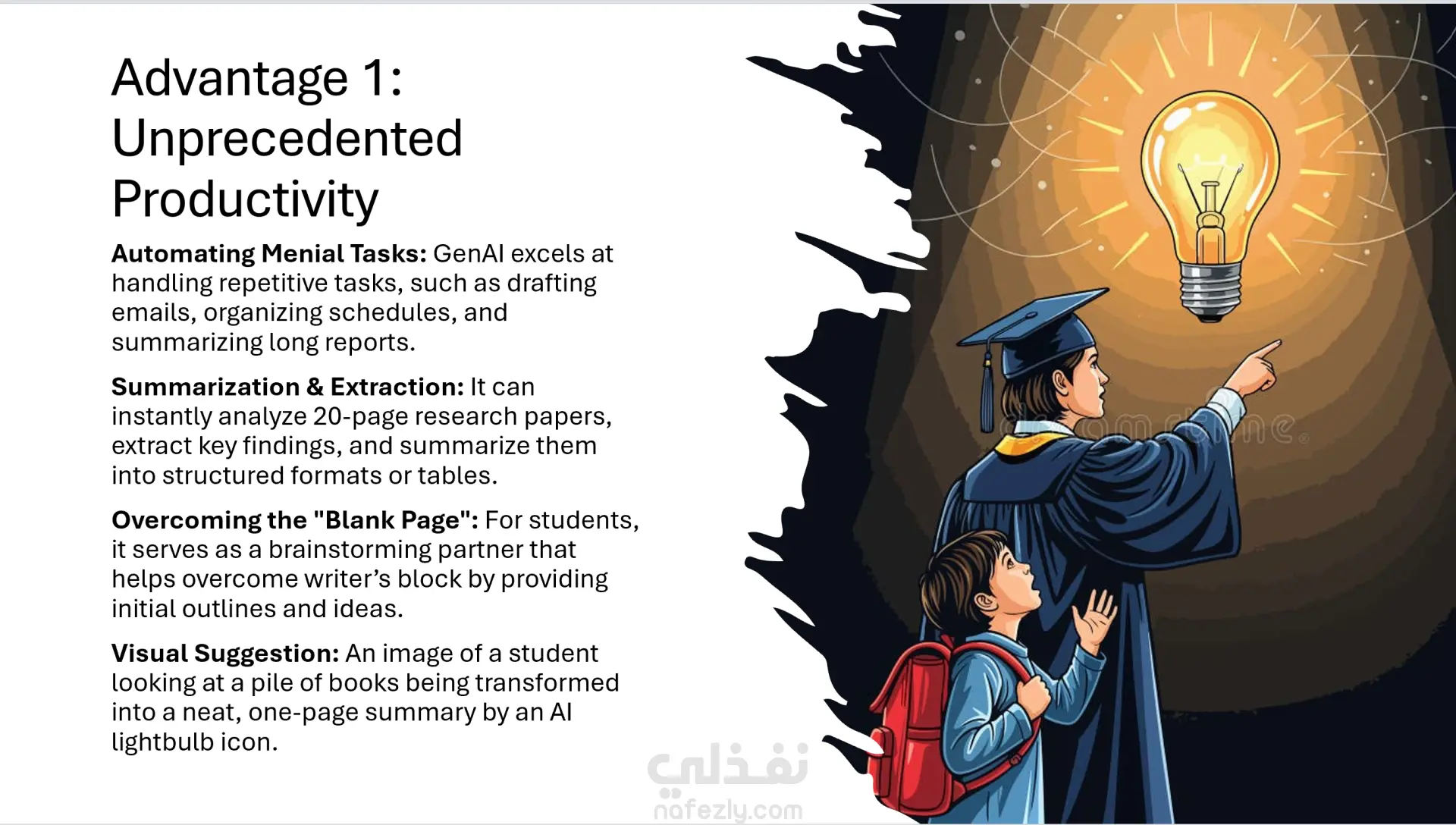 تنفيذ وتصميم عرض تقديمي (Presentation) شامل باللغة الإنجليزية، يهدف إلى تبسيط مفاهيم "الذكاء الاصطناعي التوليدي" (Generative AI) ونماذج اللغة الكبيرة (LLMs). تم إعداد هذا العرض ليكون دليلاً شاملاً وموجهاً خصيصاً للطلاب لمساعدتهم على فهم هذه الثورة التكنولوجية بأسلوب سلس وممتع.الهدف من العمل:تحويل المعلومات التقنية المعقدة إلى محتوى بصري ونصّي سهل الاستيعاب، مع تقديم تحليل موضوعي يسلط الضوء على الإيجابيات والسلبيات، لتوعية الطلاب بكيفية استخدام هذه الأدوات بمسؤولية.مميزات وتفاصيل العمل:هيكلة منطقية وسرد جذاب: تم تقسيم العرض إلى 10 شرائح متسلسلة تأخذ المتلقي في رحلة تبدأ من فهم الأساسيات والفارق بين الذكاء التقليدي والتوليدي ، مروراً بآلية عمل الـ LLMs.تغطية شاملة ومحايدة: استعراض الفوائد الأكاديمية (مثل المساعدة في البرمجة والترجمة وتلخيص المهام) ، ومناقشة التحديات بشفافية (مثل هلوسة الذكاء الاصطناعي ، التحيز ، ومخاطر الخصوصية وحقوق النشر ).دعم بصري احترافي: دمج صور توضيحية ومفاهيمية (Conceptual Art) عالية الجودة لربط النص بالصورة ، مما يسهل إيصال الفكرة المعقدة بمجرد النظر.صياغة أكاديمية مبسطة: كتابة المحتوى بلغة إنجليزية دقيقة، واضحة، ومناسبة للمستوى الأكاديمي، مع ختام العرض بقائمة لأفضل الممارسات الأخلاقية (Best Practices).الأدوات المستخدمة:Microsoft PowerPointأدوات البحث وصياغة المحتوى باللغة الإنجليزيةهذا العمل يثبت قدرتي على استلام مادة علمية معقدة، تلخيصها، هيكلتها، وإخراجها في عرض تقديمي جاهز للتسليم والشرح بأسلوب يجذب الانتباه ويحقق الهدف التعليمي أو المهني المطلوب.