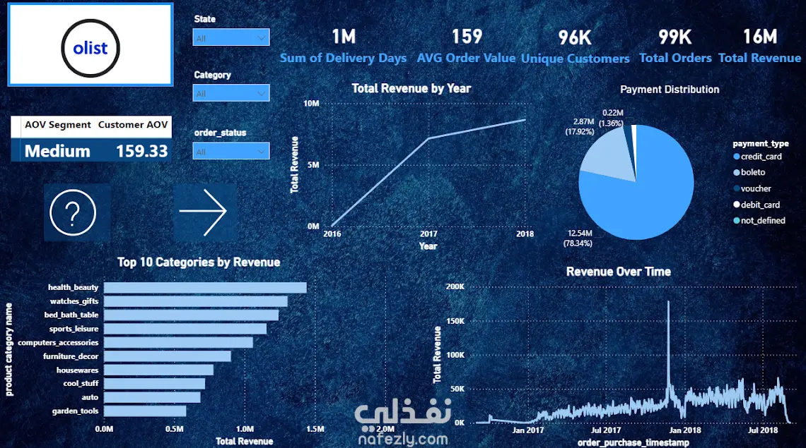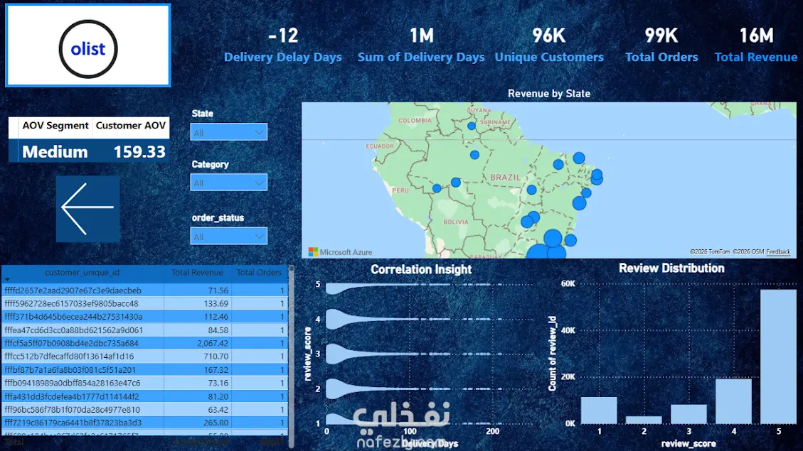 تحليل بيانات Olist E-Commerce 1. الهدف من المشروع يهدف المشروع إلى تحليل رحلة العميل بالكامل، من لحظة تقديم الطلب حتى وصوله وتقييمه. الهدف هو استخراج رؤى (Insights) تساعد الإدارة في تحسين المبيعات، وفهم سلوك المستهلك، ومعالجة مشاكل الشحن. 2. محاور التحليل الأساسية تحليل المبيعات: معرفة المنتجات الأكثر مبيعاً، وأوقات الذروة (أيام الأسبوع، الساعات، المواسم). تجربة العميل: تحليل مراجعات العملاء (Reviews) وفهم أسباب التقييمات المنخفضة. الخدمات اللوجستية: قياس أداء الشحن، ومقارنة وقت التسليم الفعلي بالوقت المتوقع. التوزيع الجغرافي: تحديد أكثر المدن والولايات طلباً للمنتجات وتكلفة الشحن لكل منطقة. طرق الدفع: دراسة تفضيلات العملاء (بطاقات ائتمان، أقساط، إلخ).