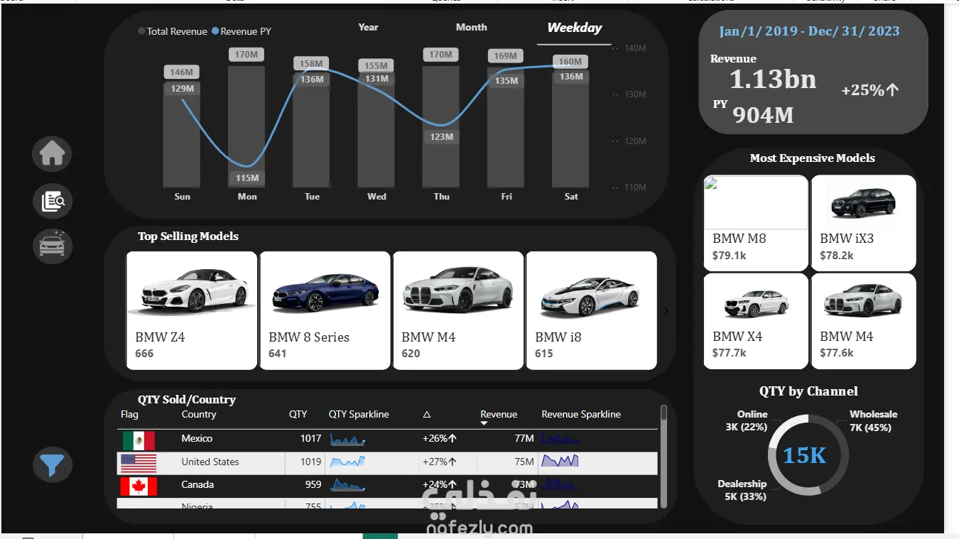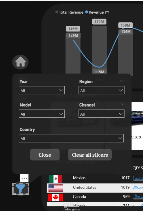 - تفاعلية متقدمة: إضافة "Slicer Panel" منبثقة تتيح تصفية البيانات حسب (السنة، المنطقة، الموديل، القناة البيعية، والدولة) للحفاظ على مساحة التصميم ونظافته.