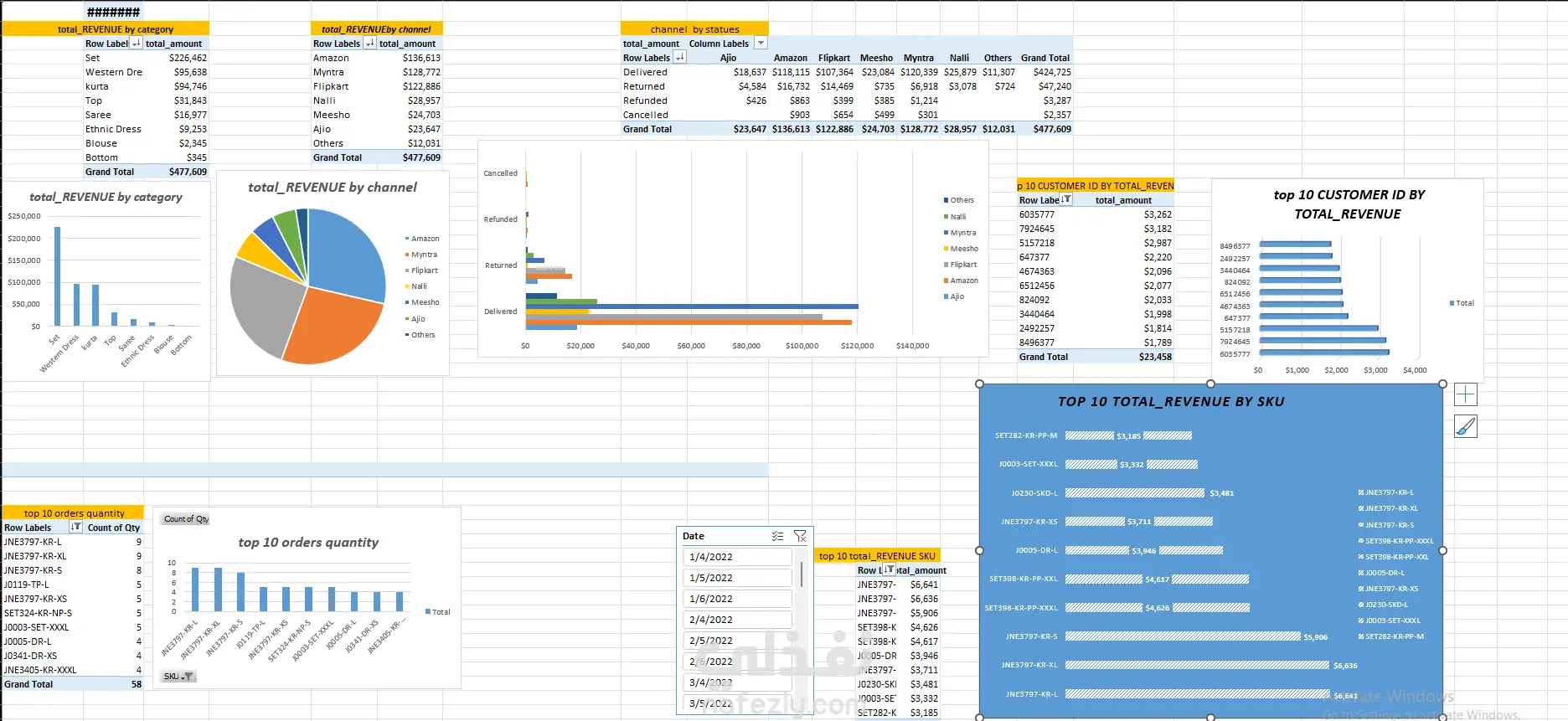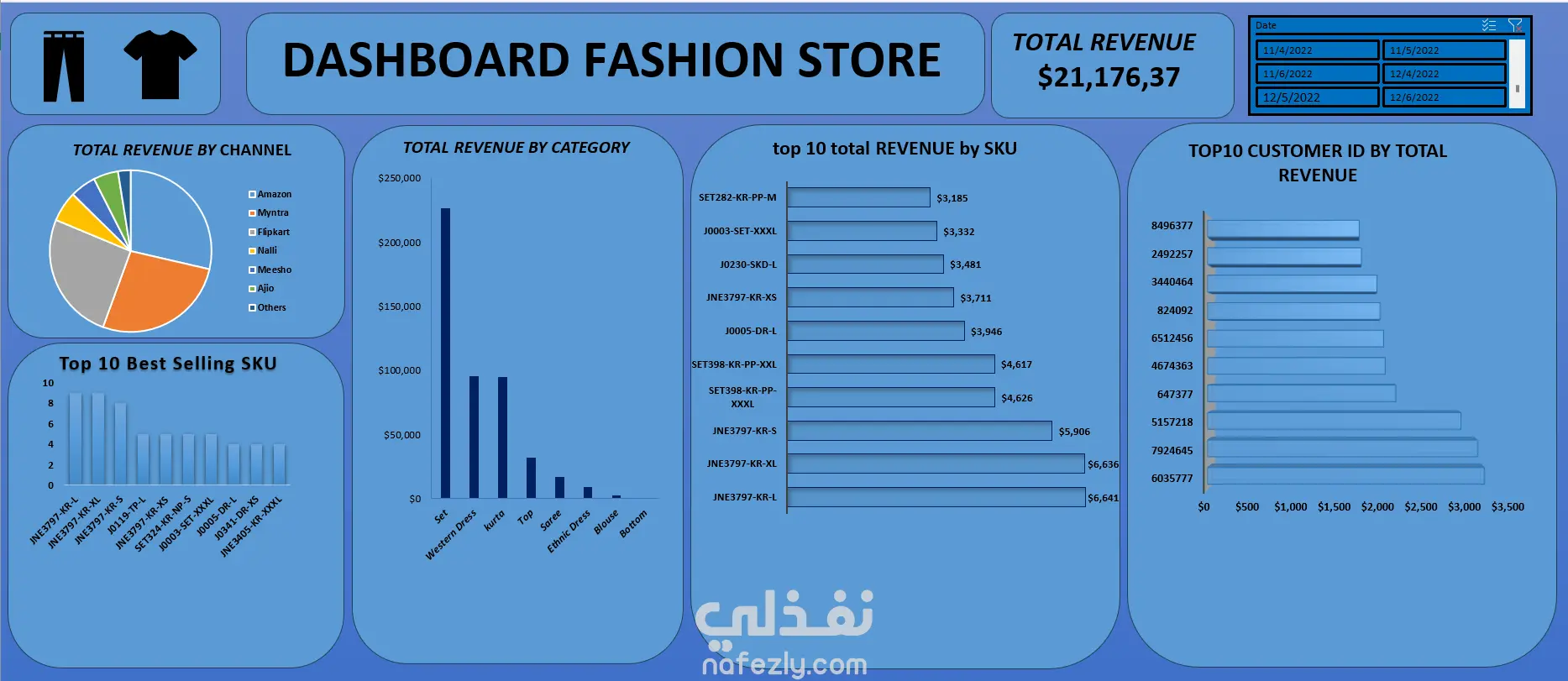 تصميم وتنفيذ لوحة تحكم (Dashboard) متكاملة لتحليل أداء مبيعات متجر إلكتروني للأزياء (Fashion Store). يهدف المشروع إلى تحويل بيانات المبيعات الخام إلى رؤى بصرية (Visual Insights) تسهل عملية اتخاذ القرار ومراقبة الأداء المالي. المحاور التي تم تحليلها: تحليل القنوات (Channel Analysis): معرفة نسبة المساهمة في الإيرادات لكل منصة (Amazon, Myntra, Flipkart, إلخ) عبر Pie Chart. أداء الفئات (Category Performance): مقارنة المبيعات بين الفئات المختلفة (Set, Western Dress, Kurta) لتحديد الأكثر مبيعاً. تحليل المنتجات (SKU Analysis): تحديد قائمة الـ Top 10 للمنتجات الأكثر تحقيقاً للإيرادات والأكثر مبيعاً من حيث العدد. ولاء العملاء (Customer Insights): رصد أفضل 10 عملاء من حيث قيمة المشتريات. المميزات التقنية: استخدام Pivot Tables و Pivot Charts لربط البيانات. إضافة Slicers تفاعلية للسماح للمستخدم بفلترة البيانات حسب التاريخ. تصميم واجهة مستخدم (UI) احترافية ومتناسقة الألوان (Data Visualization Best Practices). الأدوات المستخدمة: Microsoft Excel (Advanced)