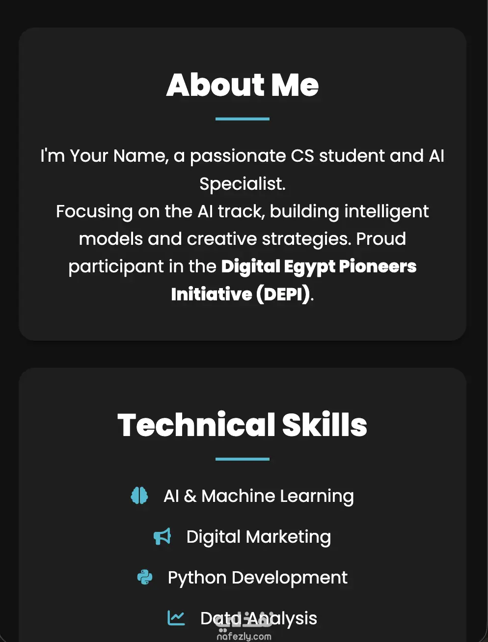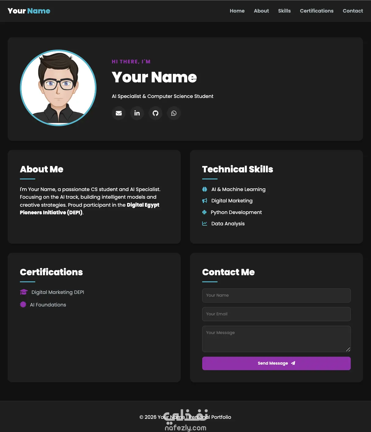 Personal Portfolio Website Core Technologies: Built using pure HTML5 and CSS3 to demonstrate solid foundational web development skills. Responsive Design: Fully responsive layout using CSS Flexbox and Grid, ensuring a seamless user experience across all devices (Desktops, Tablets, and Mobiles). Clean Code: Focused on semantic HTML for better SEO and maintainability, with organized CSS for smooth styling and layout transitions. Modern UI: Features a dark-themed, professional interface with interactive elements and custom styling.