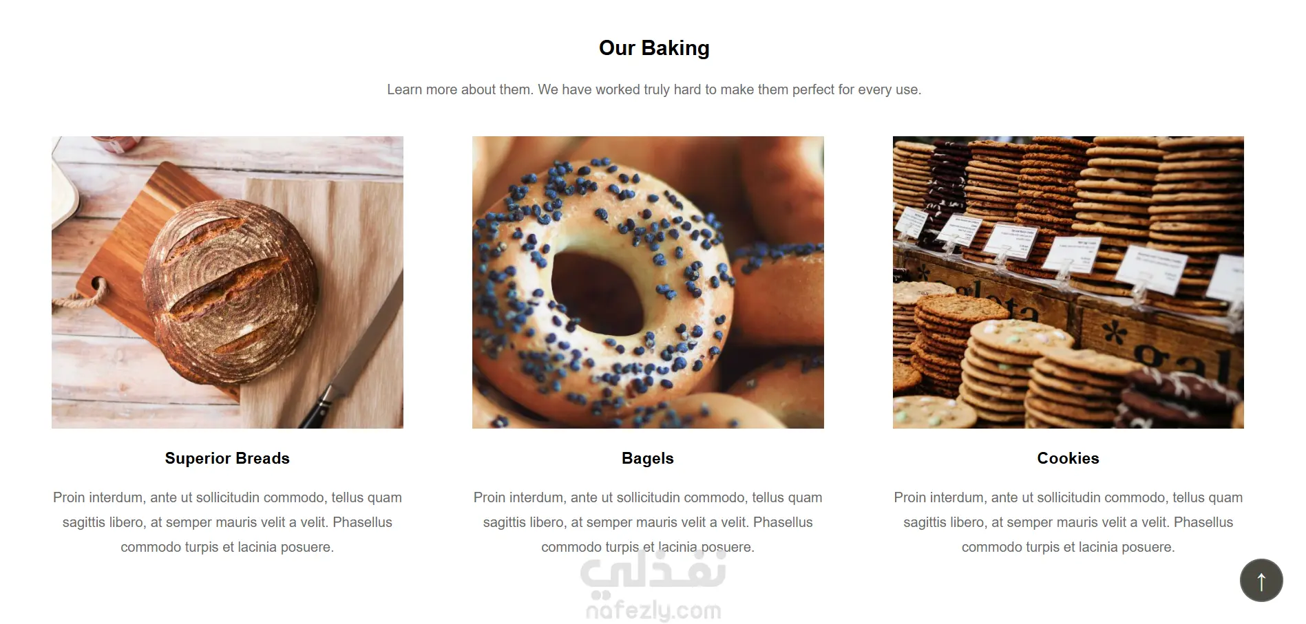 بعد كده قسم "Who We Are" بيعرّف بالمخبز مع قائمة مميزات، وقسم "Our Location" بـ layout معكوس، وقسم "Our Baking" بيعرض المنتجات في 3 كروت.