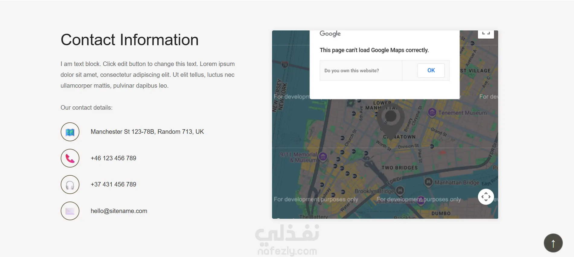 الصفحة بتنتهي بقسم Contact فيه معلومات التواصل وصورة خريطة، وفوتر بأربع أعمدة، وزرار scroll-to-top ثابت في الزاوية.