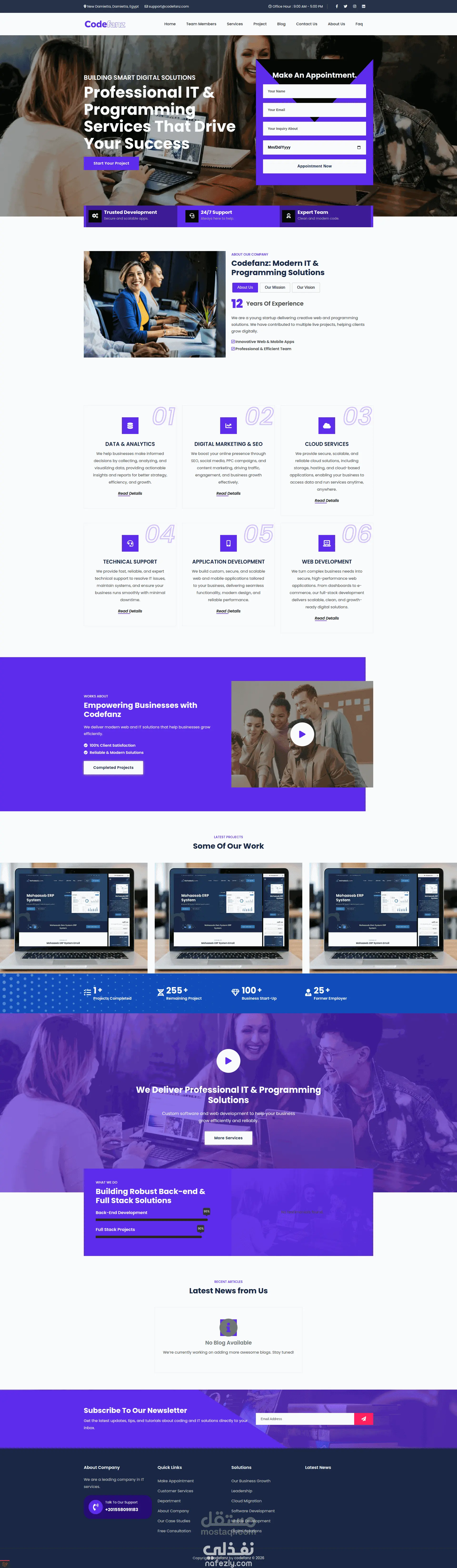 شركة Codefanz هي شركة متخصصة في تقديم حلول تكنولوجيا المعلومات والخدمات الرقمية المصممة لتلبية احتياجات الأعمال الحديثة. تأسست الشركة بهدف مساعدة الشركات والمؤسسات على تطوير حضورها الرقمي وتعزيز كفاءتها التشغيلية من خلال الابتكار التكنولوجي واستخدام أحدث الأدوات الرقمية. تركز Codefanz على تقديم مجموعة متكاملة من الخدمات التقنية التي تشمل تطوير البرمجيات، وتصميم وتطوير المواقع الإلكترونية، وحلول التجارة الإلكترونية، بالإضافة إلى دعم نظم المعلومات وإدارة البنية التحتية لتكنولوجيا المعلومات. كما تقدم الشركة خدمات متقدمة في مجال التسويق الرقمي وتحليل البيانات لضمان تحقيق النمو وزيادة العائد على الاستثمار لعملائها. في مجال تطوير البرمجيات والتطبيقات، توفر Codefanz حلولاً مخصصة تناسب احتياجات كل عميل، سواء كان ذلك تطبيقات ويب، تطبيقات جوال على أنظمة iOS وAndroid، أو برمجيات مؤسسية لإدارة العمليات الداخلية للشركات. يركز فريق الشركة على تطوير تطبيقات عالية الأداء وآمنة وسهلة الاستخدام، مع تصميم واجهات حديثة وتجربة مستخدم سلسة. بالإضافة إلى ذلك، تقدم Codefanz خدمات تصميم وتطوير المواقع الإلكترونية وحلول التجارة الإلكترونية، بما في ذلك إنشاء المواقع المخصصة، منصات البيع عبر الإنترنت، وتحسين محركات البحث SEO لضمان وصول العملاء المستهدفين وزيادة التفاعل والمبيعات. الشركة تهتم بتقديم واجهات مستخدم جذابة وتجربة تصفح مريحة تلبي توقعات المستخدمين النهائيين. من ناحية البنية التحتية والدعم الفني، توفر Codefanz حلول استضافة موثوقة، إدارة خوادم، ودعم فني مستمر لضمان استمرارية الأعمال وتقليل الأعطال والمشاكل التقنية. تشمل خدمات الدعم الفني استكشاف الأخطاء وإصلاحها، إدارة الشبكات، وأمن المعلومات لضمان حماية البيانات وحفظها بشكل آمن. كما تركز الشركة على التحليلات والبيانات لمساعدة العملاء على اتخاذ قرارات استراتيجية مدعومة بالمعلومات الدقيقة. يتم ذلك من خلال جمع وتحليل البيانات، إنشاء تقارير ولوحات معلومات تفاعلية، وتقديم توصيات قابلة للتنفيذ لتحسين الأداء وزيادة الإنتاجية. تسعى Codefanz دائمًا إلى الابتكار والتطوير المستمر، مع تبني أحدث التقنيات مثل الذكاء الاصطناعي، إنترنت الأشياء، وتقنيات الواقع المعزز والافتراضي لتقديم حلول مبتكرة تساعد الشركات على التميز في أسواقها. باختصار، تعتبر Codefanz شريكًا موثوقًا للشركات التي تبحث عن حلول تقنية متكاملة، مع التركيز على الجودة، الأداء، والأمان، لضمان تحقيق أهداف العمل بفعالية واستدامة.