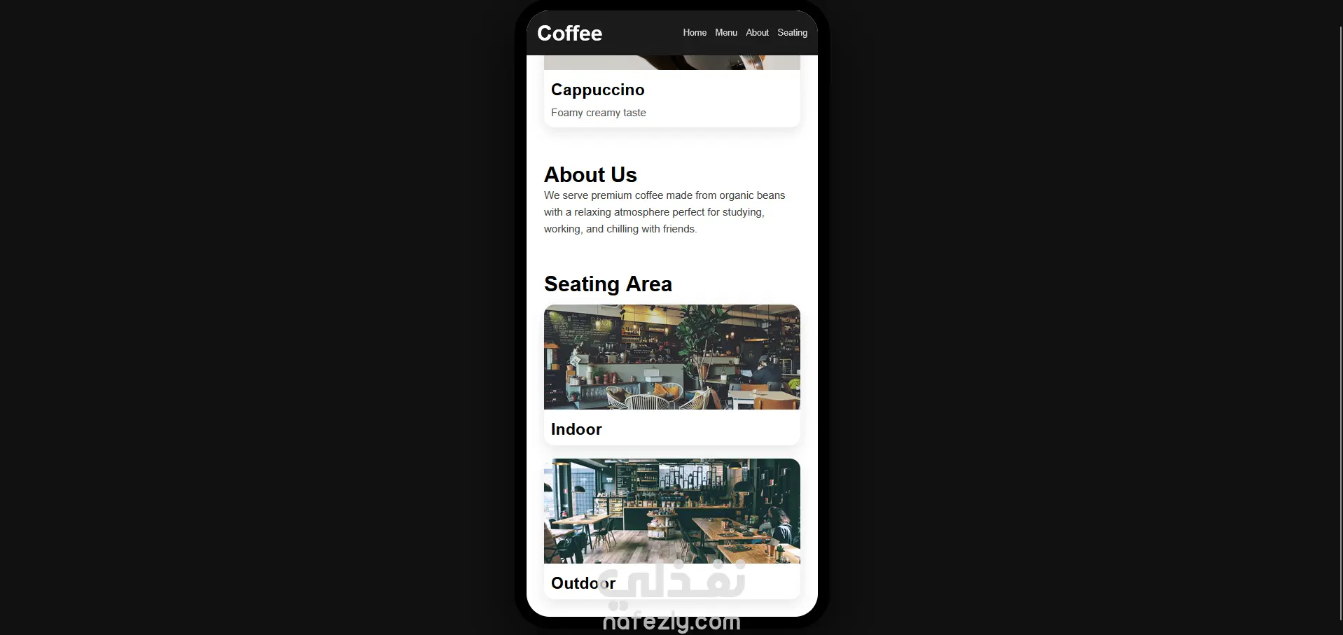 التصميم بيكون شيك وهادي بألوان دافئة تناسب جو الكافيه، وبيحتوي على صفحات زي: