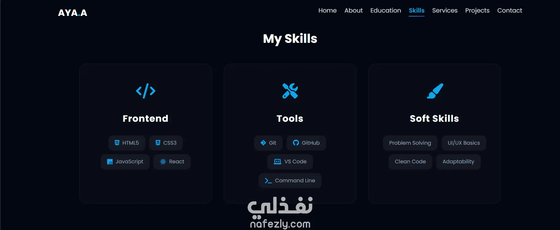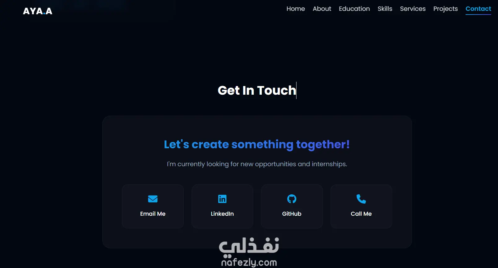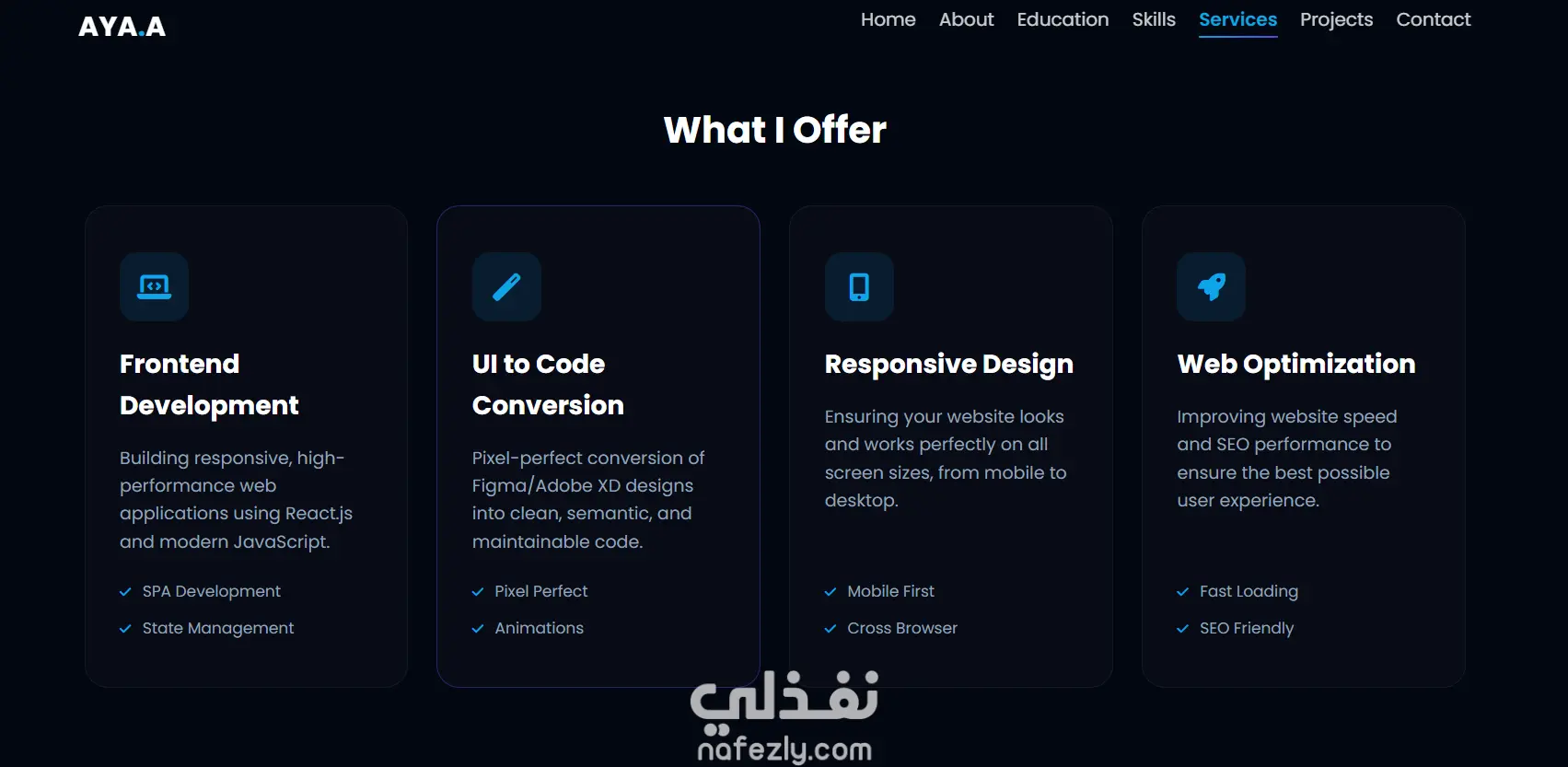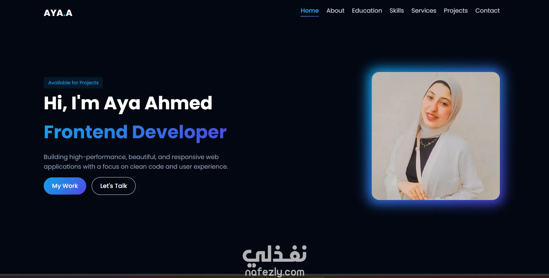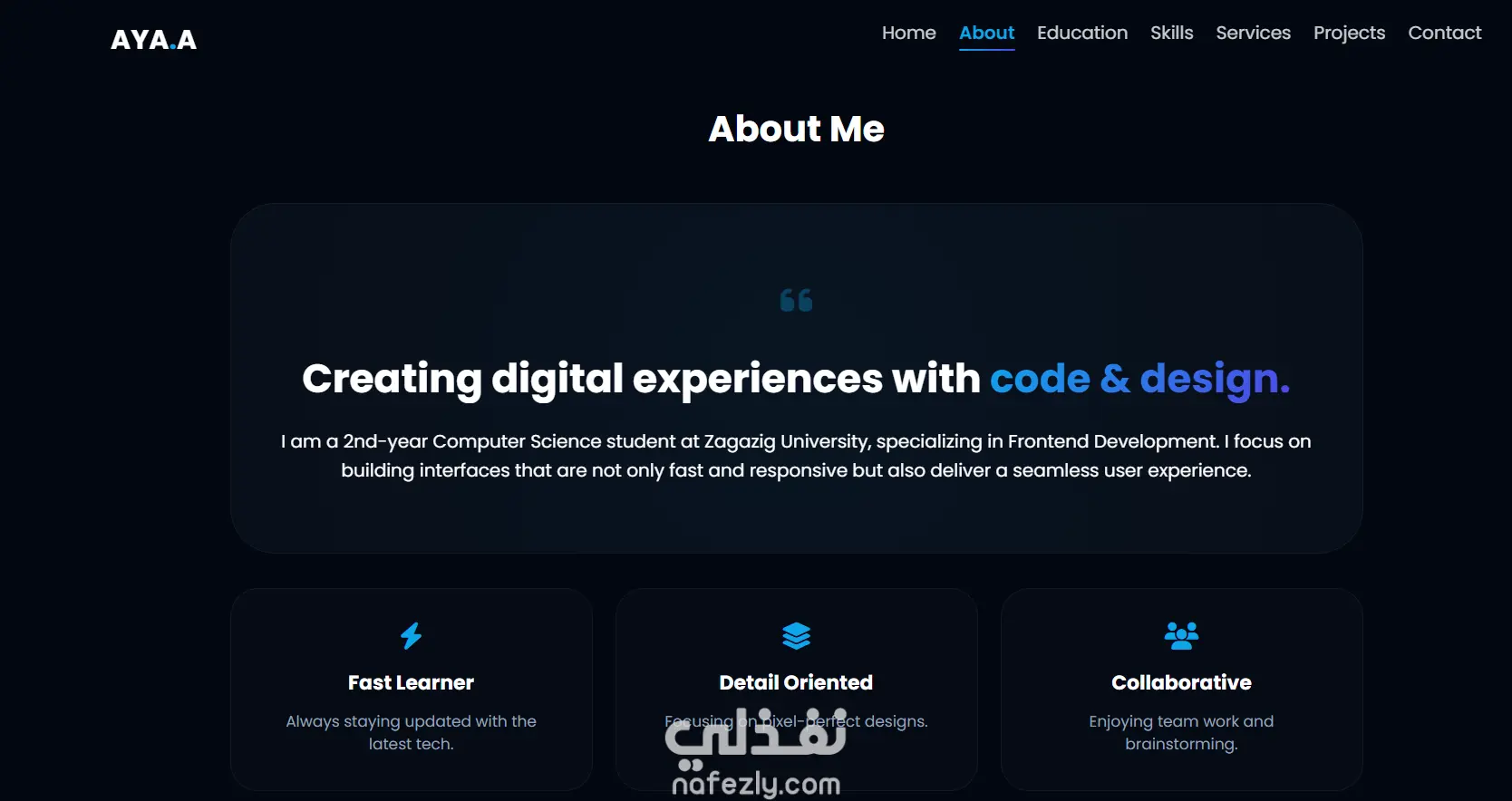 موقع شخصي تفاعلي تم تطويره باستخدام HTML وCSS وJavaScript لعرض مهاراتي ومشاريعي في مجال Front-End Development. يحتوي الموقع على أقسام: النبذة عني، المهارات، المشاريع وطرق التواصل.