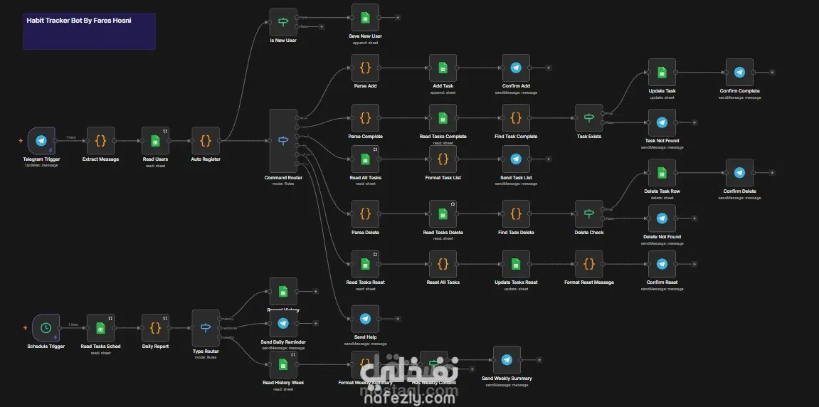 تطوير نظام أتمتة متكامل (Automation System) عبر منصة n8n ليعمل كمساعد شخصي ذكي على منصة تليجرام. يقوم النظام بإدارة مهام المستخدمين، تتبع عاداتهم اليومية، وتوليد تقارير أداء دورية بشكل آلي تماماً (بدون تدخل بشري) بالاعتماد على جداول جوجل (Google Sheets) كقاعدة بيانات سحابية.