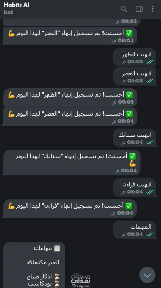 2- إدارة المهام بمرونة: القدرة على (إضافة، إكمال، سرد، ومسح) المهام من خلال أوامر نصية بسيطة وطبيعية عبر تليجرام.