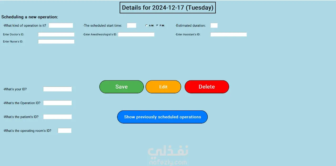 تطبيق مكتبي لإدارة وتنظيم جداول العمليات الجراحية، يهدف إلى تقليل العشوائية داخل غرف العمليات وضمان عدم حدوث تعارضات في المواعيد أو توزيع الطاقم الطبي. تم تطوير النظام باستخدام Python للـ Backend وربطه بقاعدة بيانات Microsoft SQL Server، مع تصميم قاعدة البيانات وفق قواعد 3NF لضمان الكفاءة وسلامة البيانات. يوفر النظام صلاحيات مختلفة للأطباء، وإدارة كاملة لقائمة العمليات، مع تنظيم توزيع الأطباء والممرضين والمرضى بحيث لا يحدث تداخل في العمليات أو المواعيد.
