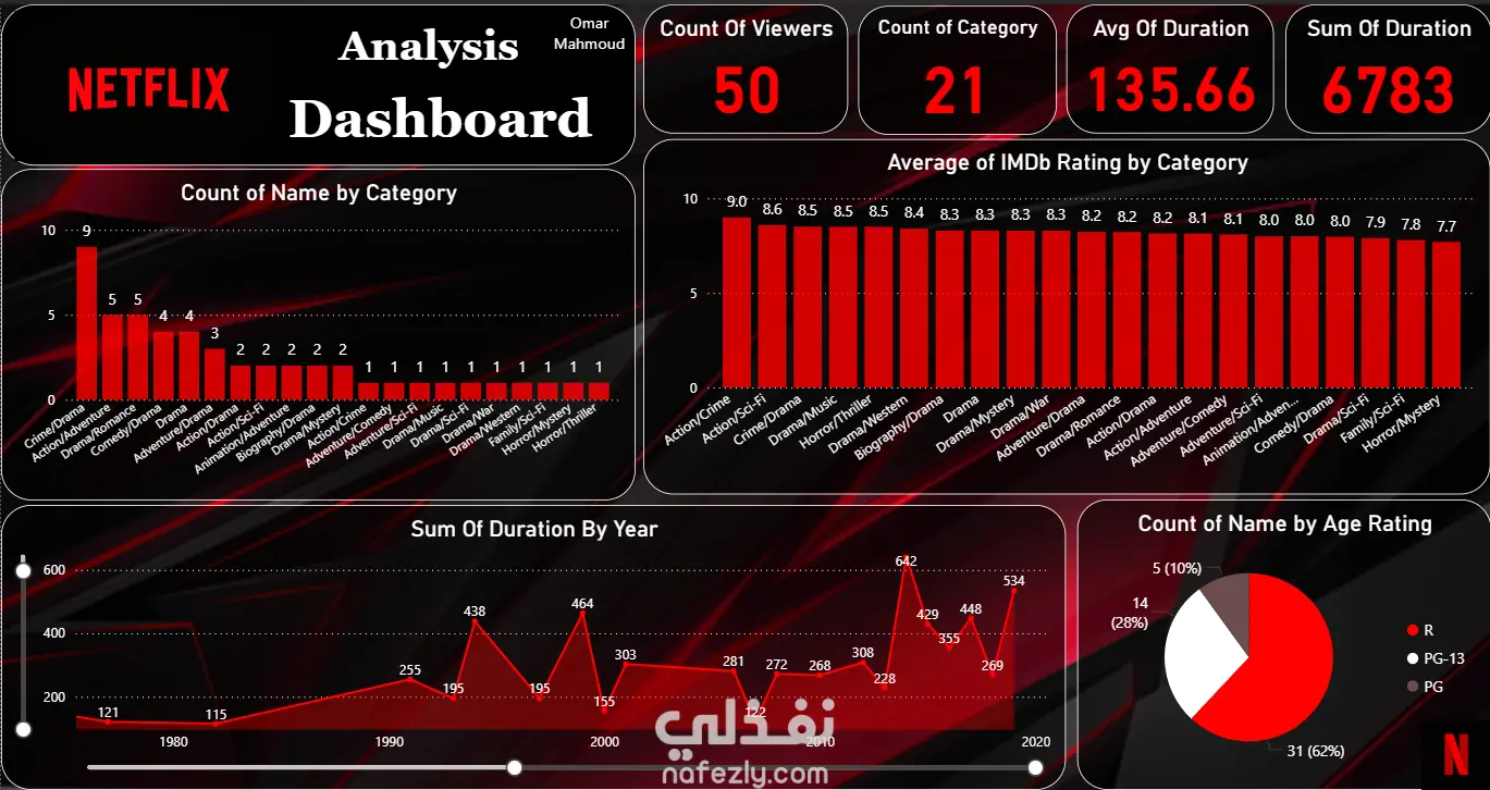 تحليل شامل لمحتوى منصة نتفليكس لفهم توجهات المشاهدة، تصنيفات المحتوى، وتقييمات الجمهور. أبرز المميزات التقنية: تحليل التصنيفات (Genres): عرض أكثر الفئات إنتاجاً وتقييماً (مثل الأكشن، الدراما، والجريمة). مؤشرات المشاهدة: تتبع عدد المشاهدين، إجمالي ساعات العرض، ومتوسط مدة المحتوى. التحليل الزمني: خط زمني يوضح تطور مدة المحتوى المنتج عبر السنوات (Sum of Duration by Year). تصنيف الجمهور: تحليل توزيع المحتوى حسب الفئات العمرية (R, PG-13, PG) باستخدام رسوم بيانية دائرية واضحة. تقييمات IMDb: مقارنة متوسط التقييمات لكل فئة لتحديد المحتوى الأعلى جودة.