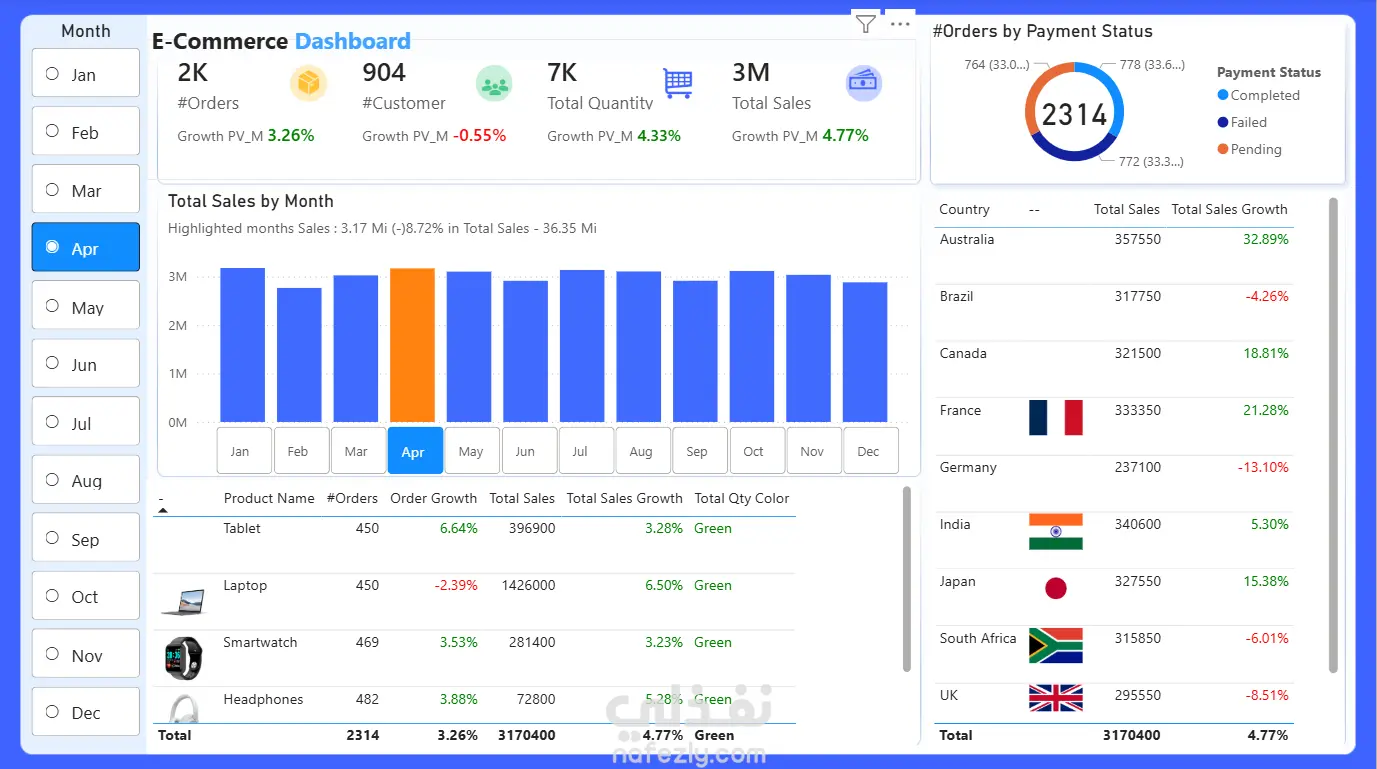 قمت بتصميم Dashboard احترافي لتحليل بيانات التجارة الإلكترونية باستخدام Power BI، يهدف إلى متابعة أداء المبيعات وتحليل سلوك العملاء بشكل واضح. يشمل العمل: تحليل إجمالي المبيعات والطلبات والعملاء متابعة الأداء الشهري للمبيعات تحليل حالة الطلبات (Completed / Pending / Failed) تحليل المنتجات الأكثر طلبًا تحليل المبيعات حسب الدول مع معدل النمو تم تصميم الداشبورد بطريقة تفاعلية تسهل استكشاف البيانات واتخاذ قرارات مبنية على الأرقام.