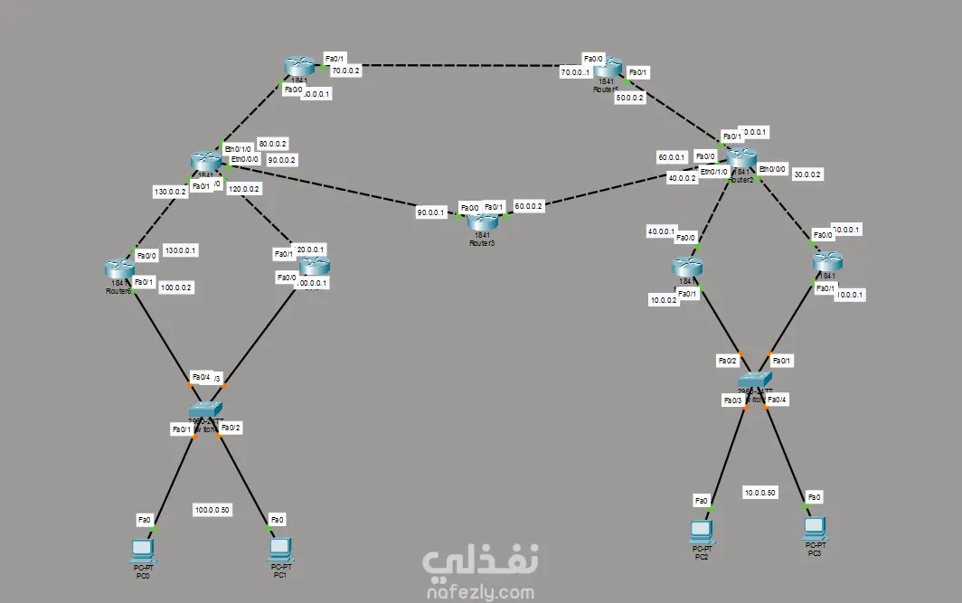 I designed and implemented a complete enterprise network that simulates a multi-branch company environment. The network connects multiple routers to ensure reliable communication between different branches, while end devices (PCs) are connected through switches. The design is based on dividing the network into multiple subnets with organized IP addressing to ensure efficient management and avoid conflicts.