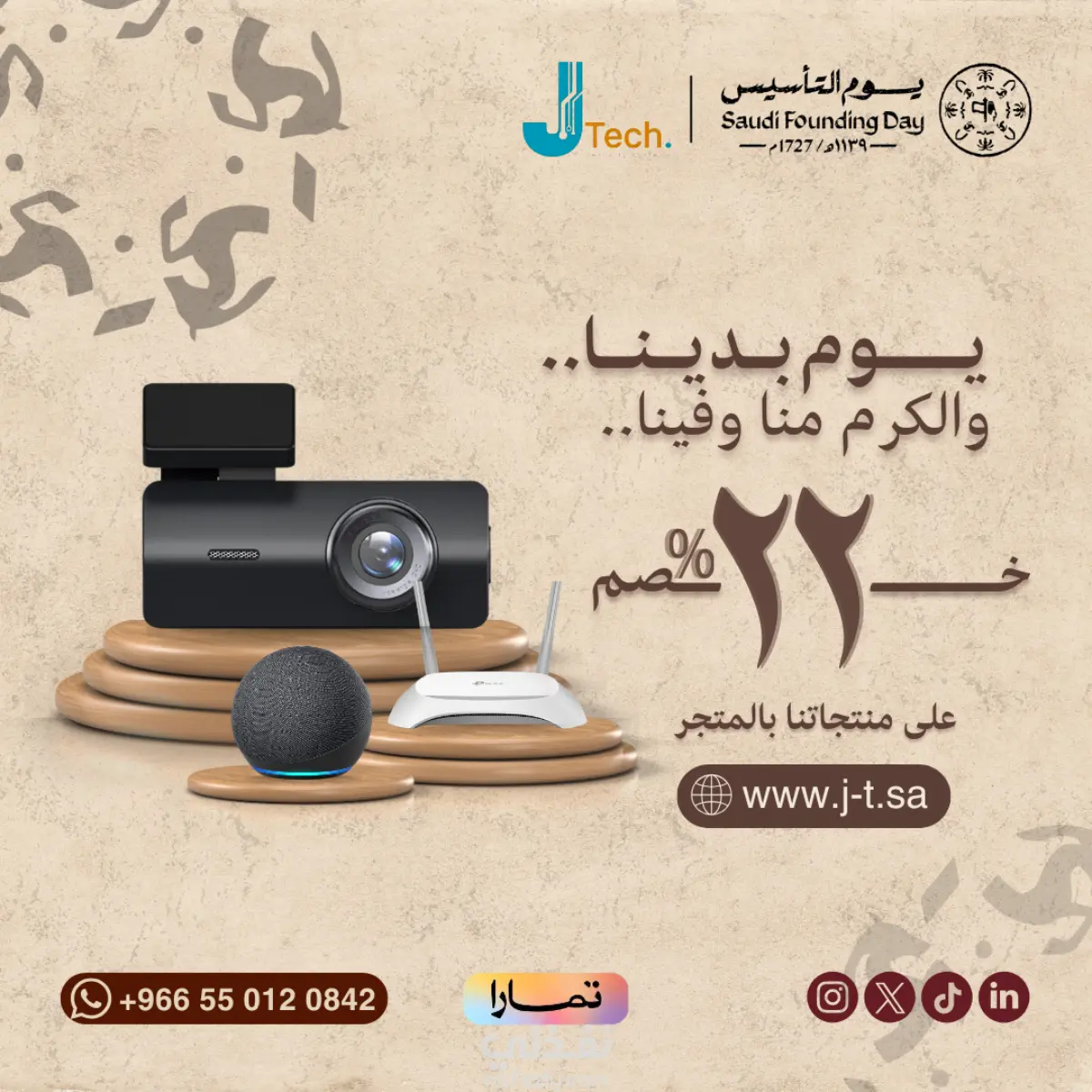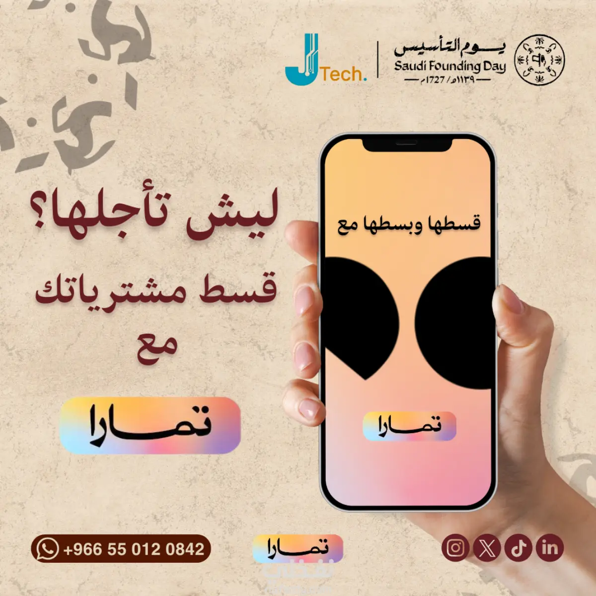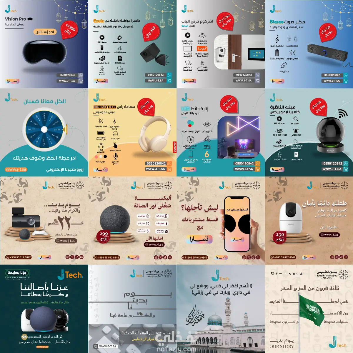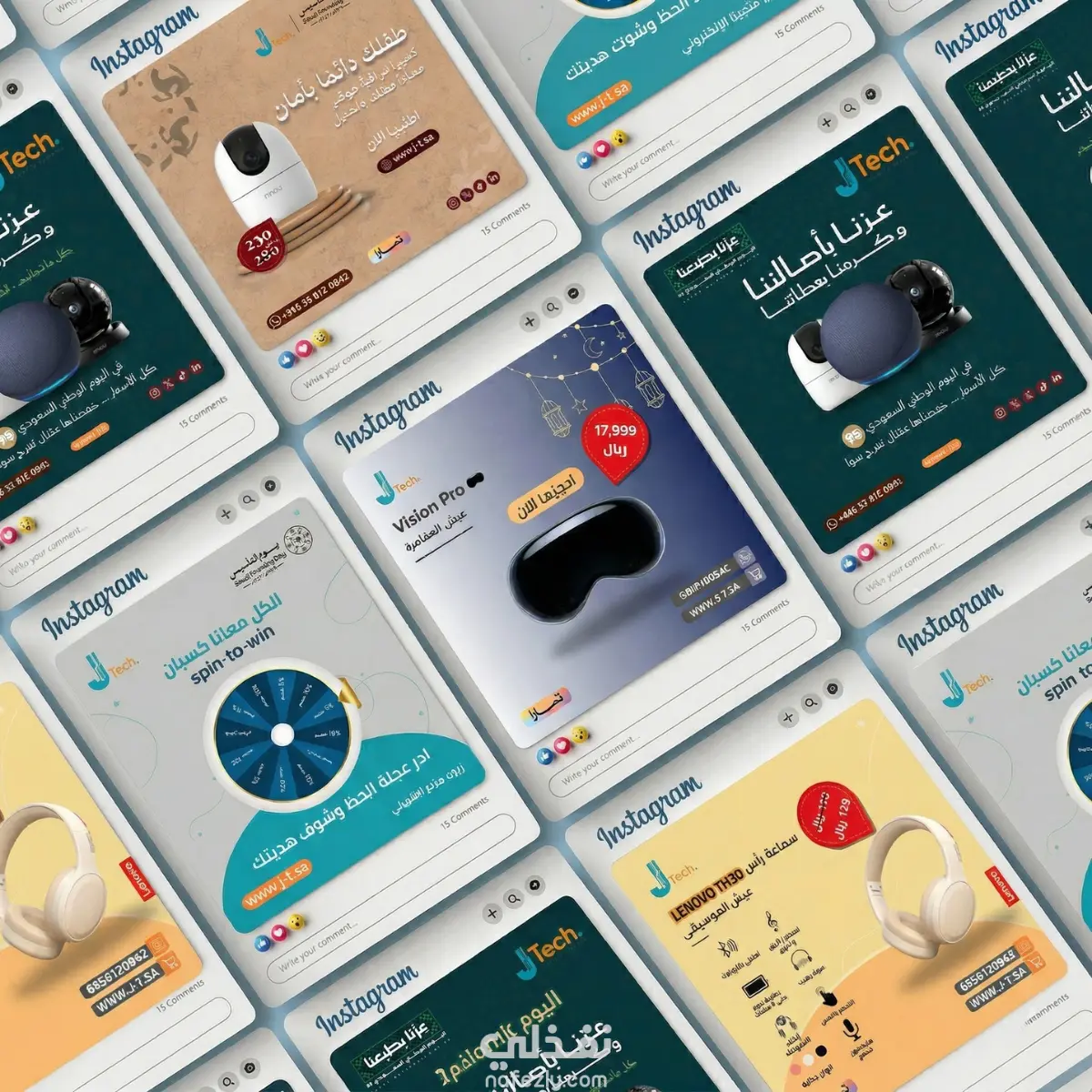 بصفتي مصمم الجرافيك لهذا المشروع، تشرفت بالعمل على تطوير المحتوى المرئي لشركة J.Tech (جنون التقنية) في السعودية. كان هدفي الأساسي كمصمم هو ترجمة أهداف الشركة التسويقية إلى تصميمات سوشيال ميديا احترافية، تزيد من تفاعل الجمهور وترفع معدلات التحويل (المبيعات). ما قمت بتنفيذه إبداعياً: تصميم إعلانات بيعية (Conversion-focused Design): صممت بوستات تركز على إبراز المنتجات (مثل Vision Pro وكاميرات المراقبة) بأسلوب يجمع بين الفخامة والوضوح، مع تسليط الضوء على خيارات الدفع (تمارا) لتشجيع العميل السعودي على الشراء السريع. تصميم الحملات الوطنية: دمجت الهوية البصرية للشركة مع "دليل الهوية الرسمية" للمناسبات السعودية (يوم التأسيس واليوم الوطني)، مما خلق تواصلاً عاطفياً قوياً مع الجمهور المحلي. معالجة الصور والدمج (Photo Manipulation): استخدام احترافي لبرامج (Photoshop, Canva, AI Tools) لإظهار المنتجات التقنية بأعلى جودة ممكنة ومناسبة للعرض الرقمي.