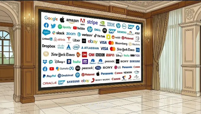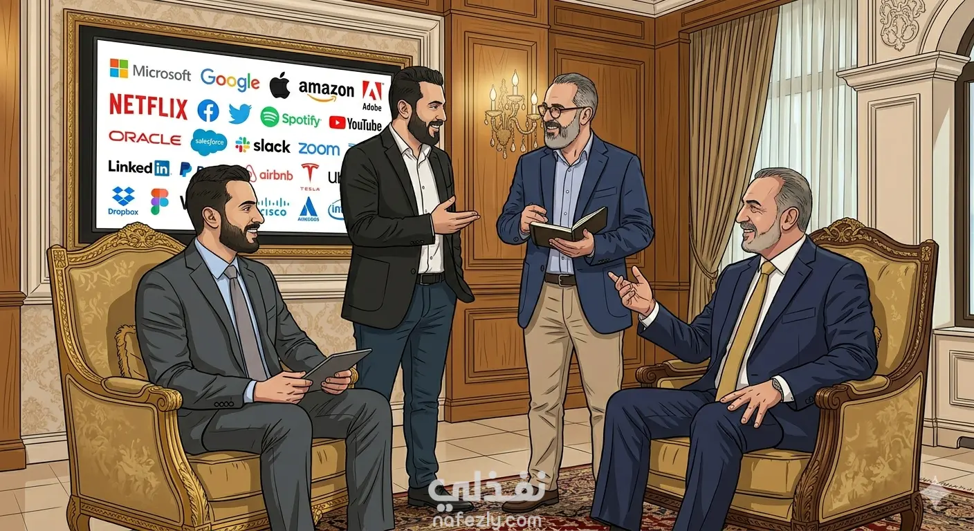 هذه اللوحة ليست مجرد رسم كرتوني، بل هي تجسيد بصري لـ "غرفة عمليات" استراتيجية رفيعة المستوى، حيث يلتقي العراقة بالطموح الرقمي.في مشهد غني بالفخامة، داخل قاعة ملكية ذات زخارف خشبية داكنة وتفاصيل كلاسيكية مذهبة، يلتف أربعة قادة وصناع قرار حول شاشة عرض عملاقة تحتل المشهد كقلب نابض.هذه الشاشة ليست مجرد شاشة، بل هي "لوحة الشرف الرقمية" التي تضم كوكبة من عمالقة التكنولوجيا والإعلام في العالم: من "جوجل" و"أمازون" إلى "أبل" و"نتفليكس". الشعارات مصطفة بدقة، كأنها فيالق تنتظر الأمر .في الصورة الرئيسية، نرى الديناميكية في أبهى صورها: