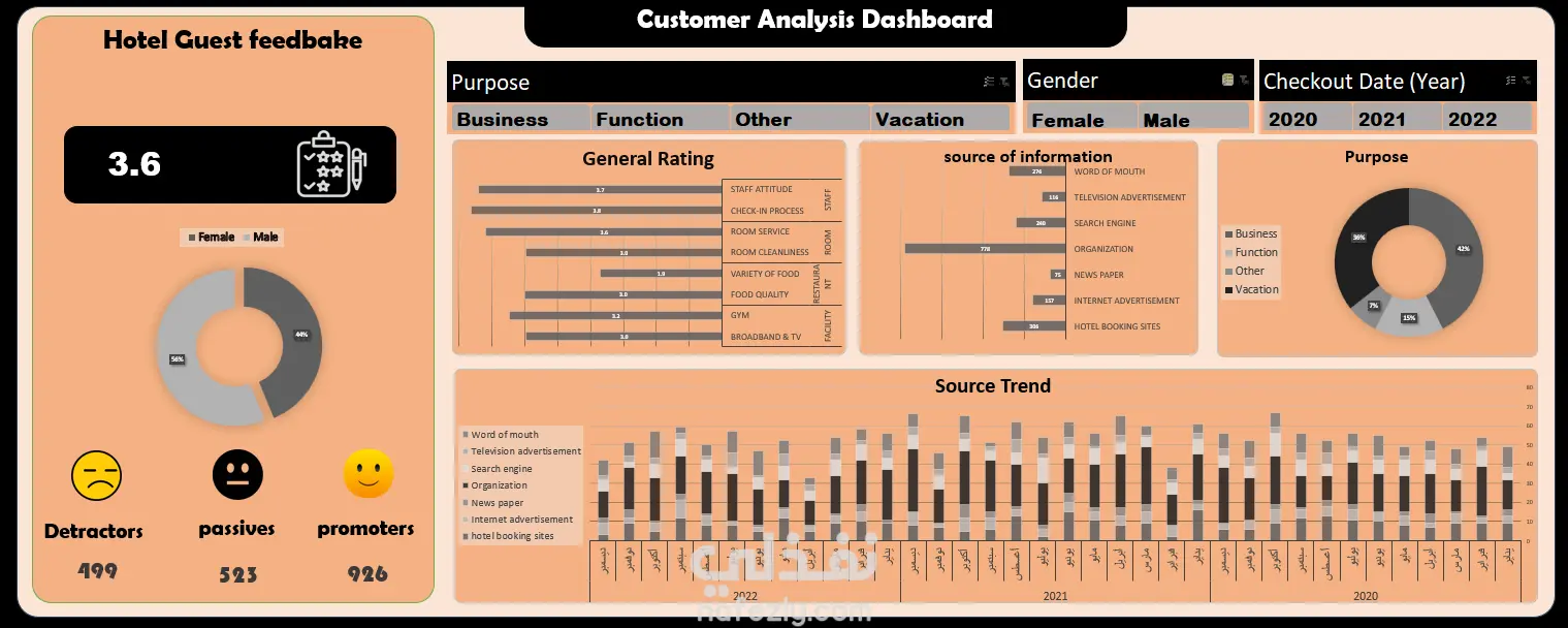 تصميم وتنفيذ لوحة تحكم تفاعلية لتحليل آراء نزلاء فندق (Customer Feedback Dashboard) باستخدام Power Query و Microsoft Excel. تم بناء Dashboard تحليلية متكاملة لتحليل تجربة العملاء وقياس مستوى الرضا باستخدام بيانات تقييمات النزلاء. اعتمد المشروع على تنظيف البيانات ومعالجتها داخل Power Query Editor ثم إنشاء تحليلات تفاعلية باستخدام PivotTables و Charts داخل Excel. اللوحة تساعد الإدارة على فهم: مستوى رضا العملاء توزيع التقييمات حسب النوع والغرض من الزيارة تحليل NPS (Net Promoter Score) مصادر معرفة العملاء بالفندق الاتجاهات الزمنية حسب سنة تسجيل الخروج تتضمن اللوحة: متوسط التقييم العام عدد العملاء حسب النوع (Gender) عدد العملاء حسب فئة NPS (Promoters – Passives – Detractors) متوسط التقييم لكل عنصر خدمة عدد العملا حسب مصدر المعرفة عدد العملاء حسب الغرض من الزيارة تحليل الاتجاهات حسب سنة تسجيل الخروج والمصدر تم إضافة Slicers تفاعلية (Gender – Year – Purpose) لتحديث جميع الرسوم البيانية تلقائيًا. طريقة التنفيذ: تنظيف وتجهيز البيانات باستخدام Power Query (إزالة القيم المكررة، معالجة القيم الناقصة، توحيد التنسيقات). إنشاء أعمدة محسوبة مثل تصنيف NPS وتقسيم السنوات من تاريخ الـ Checkout. بناء PivotTables لاستخراج مؤشرات الأداء المطلوبة تصميم Pivot Charts لعرض التحليلات بشكل بصري واضح. إضافة Slicers تفاعلية (Gender – Year – Purpose) وربطها بجميع العناصر. تنسيق وتصميم Dashboard بشكل احترافي ومنظم لسهولة القراءة واتخاذ القرار.
