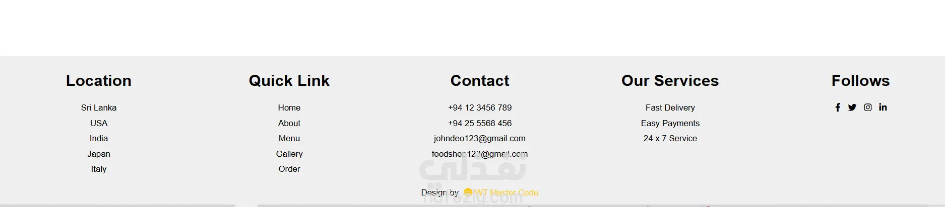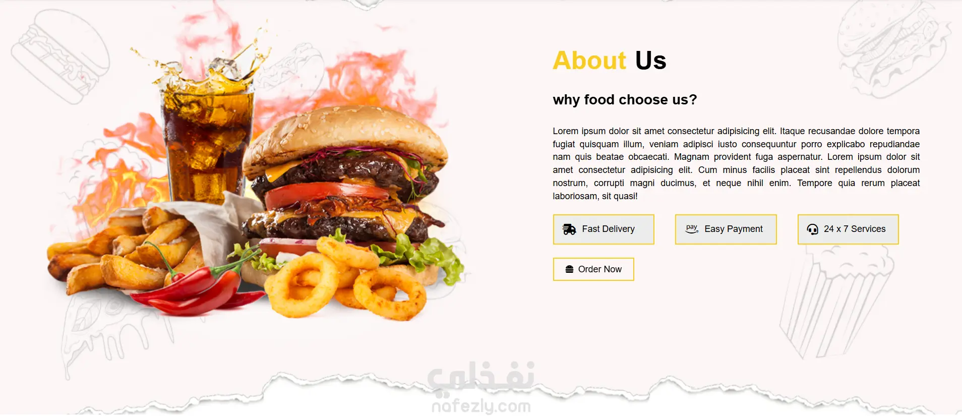 الموقع يتضمن صفحة رئيسية بتصميم عصري، وقسم للتعريف بالمطعم، وعرض قائمة الطعام مع الأسعار، ومعرض للصور، وقسم للمدونة، بالإضافة إلى نموذج لطلب الأوردر أونلاين وبيانات التواصل.