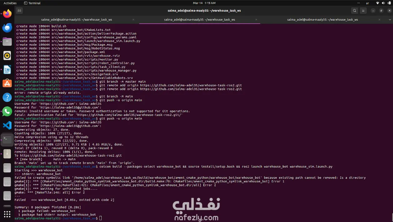 نظام روبوتات مستقلة لإدارة المستودعات باستخدام ROS 2 وصف العمل: طورت نظام محاكاة لروبوتات مستقلة لإدارة مستودع ذكي باستخدام ROS 2 Humble على Ubuntu 22.04. يعتمد النظام على معمارية multi-agent حيث تتواصل الروبوتات عبر ROS 2 nodes وtopics وservices لتنفيذ مهام التخزين والاسترجاع بشكل آلي. يشمل المشروع خوارزميات تعيين المهام، ومراقبة حالة الروبوتات في الوقت الفعلي، وملفات launch لتشغيل النظام بالكامل.